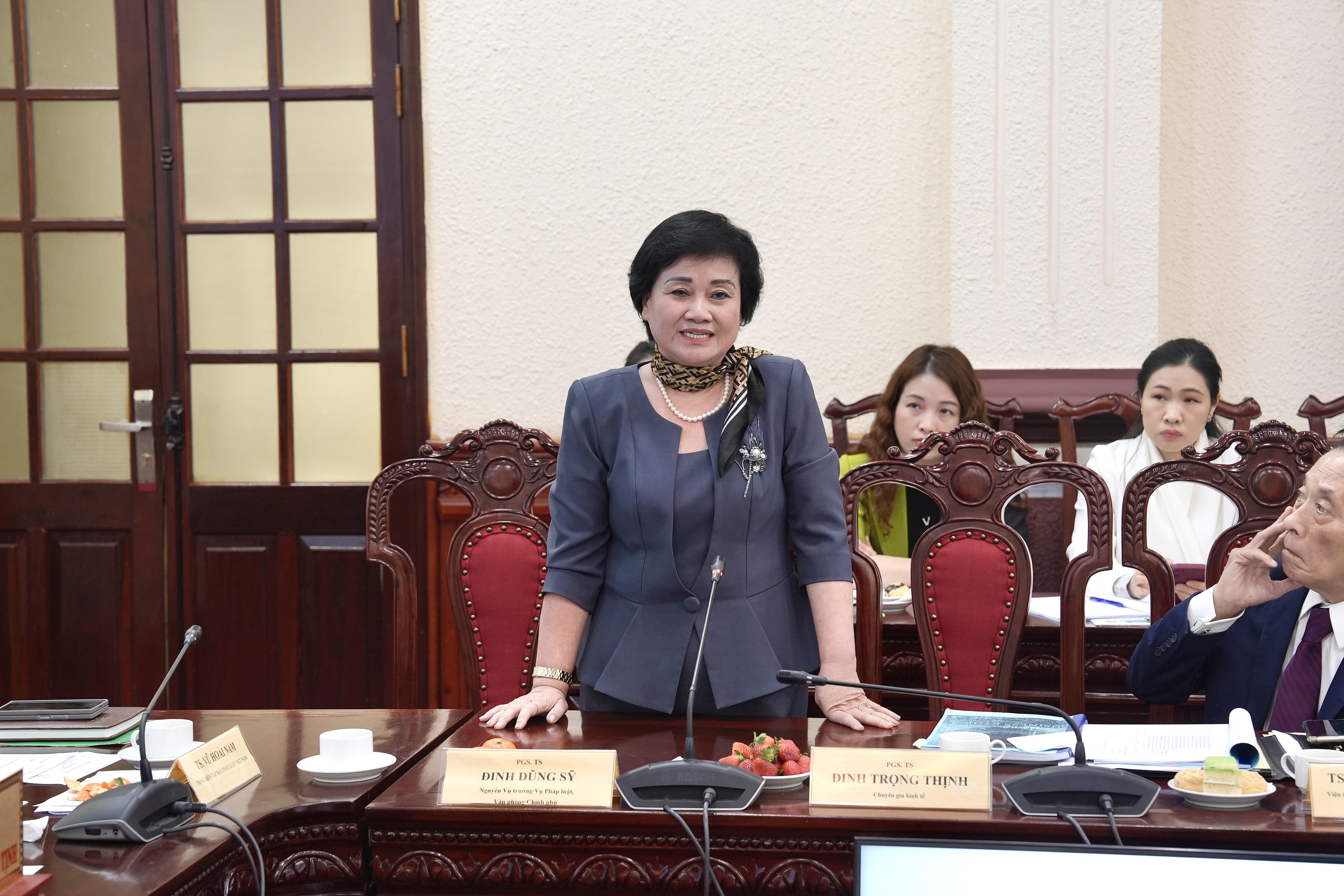 Đồng Chủ trì và điều hành Toạ đàm là TS Vũ Hoài Nam - Tổng Biên tập Báo Pháp luật Việt Nam; TS. Nguyễn Thanh Tú, Vụ trưởng Vụ Pháp luật Dân sự - Kinh tế; Ông Bạch Quốc An, Vụ trưởng Vụ Pháp luật Quốc tế, Bộ Tư pháp.