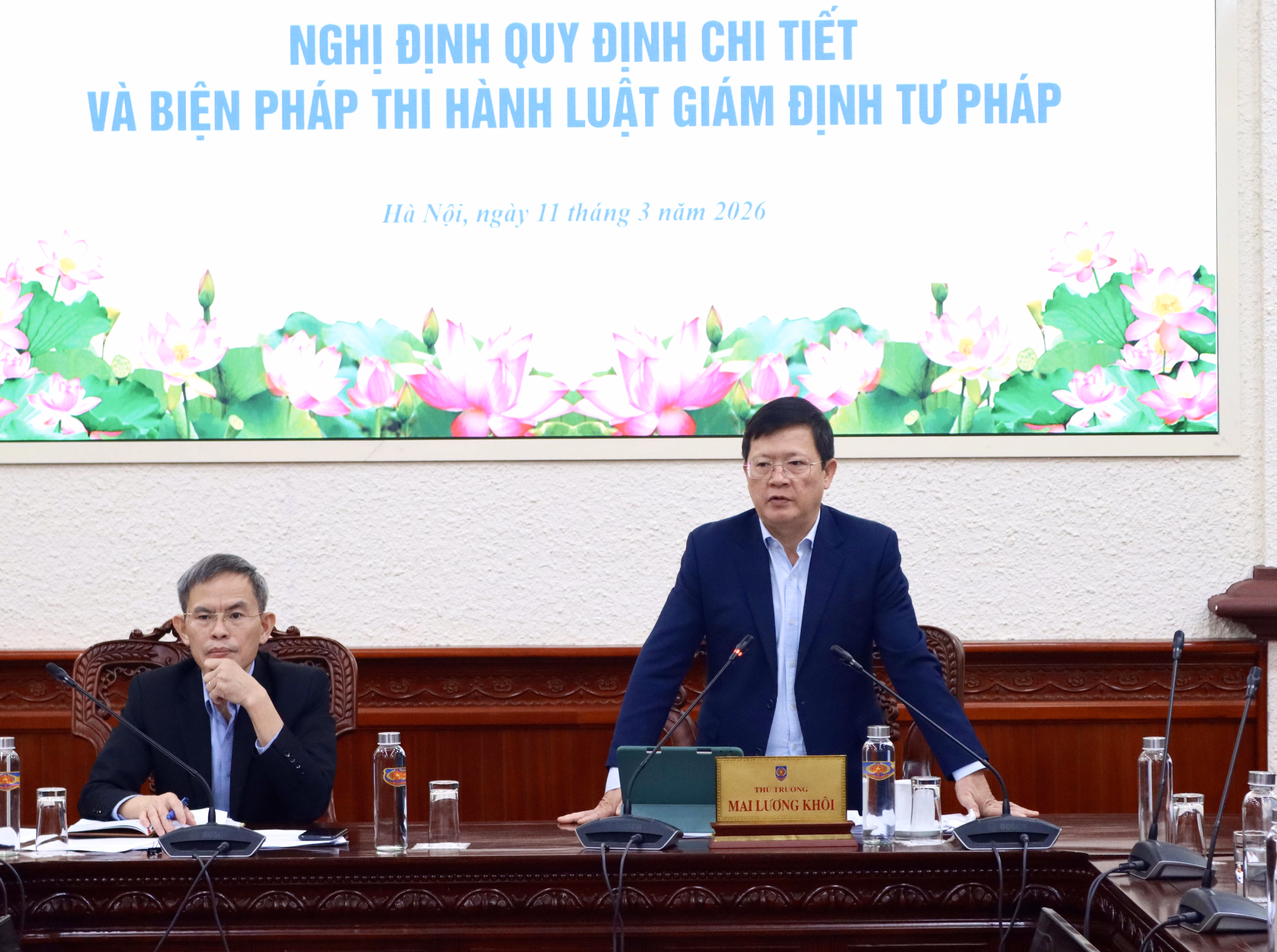 Phát biểu tại cuộc họp, Thứ trưởng Mai Lương Khôi cho biết, Luật Giám định tư pháp đã được Quốc hội khóa XV thông qua và sẽ có hiệu lực từ ngày 1/5/2026. Bộ Tư pháp được giao chủ trì xây dựng Nghị định quy định chi tiết và biện pháp thi hành Luật. Thứ trưởng đề nghị các đại biểu cho ý kiến tập trung vào một số nội dung sửa đổi, bổ sung một số quy định của Luật Giám định tư pháp năm 2012 như: các quy định về bổ nhiệm, miễn nhiệm giám định viên tư pháp; công nhận người, tổ chức giám định theo vụ việc; tổ chức và hoạt động của các tổ chức giám định tư pháp…
