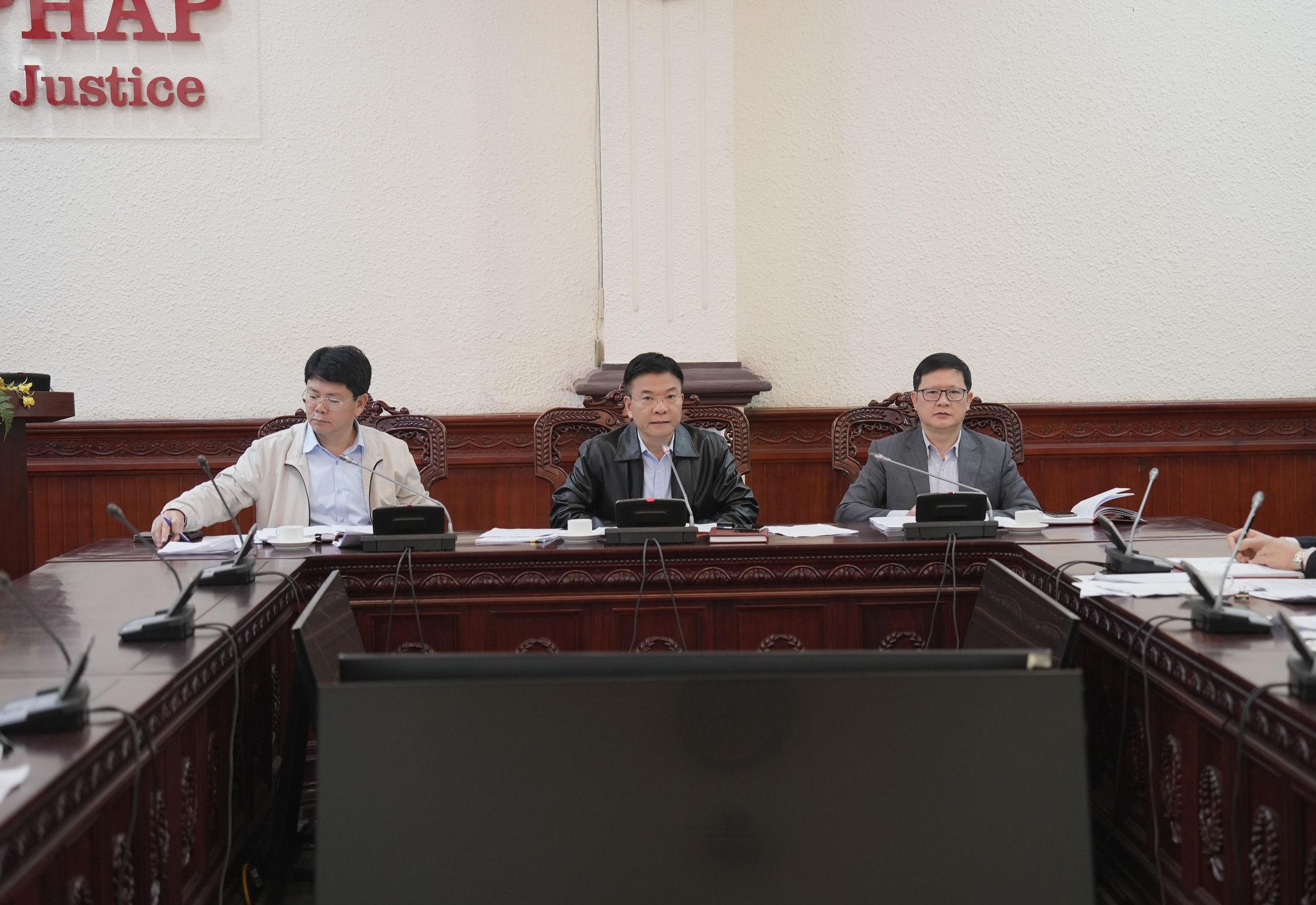 (PLVN) -Chiều 16/2, Bộ trưởng Lê Thành Long đã làm việc với các đơn vị về việc triển khai Chương trình công tác năm 2023 của BCĐTW về phòng, chống tham nhũng và nhiệm vụ của thành viên BCĐ. Thứ trưởng Nguyễn Thanh Tịnh, Thứ trưởng Mai Lương Khôi cùng dự.