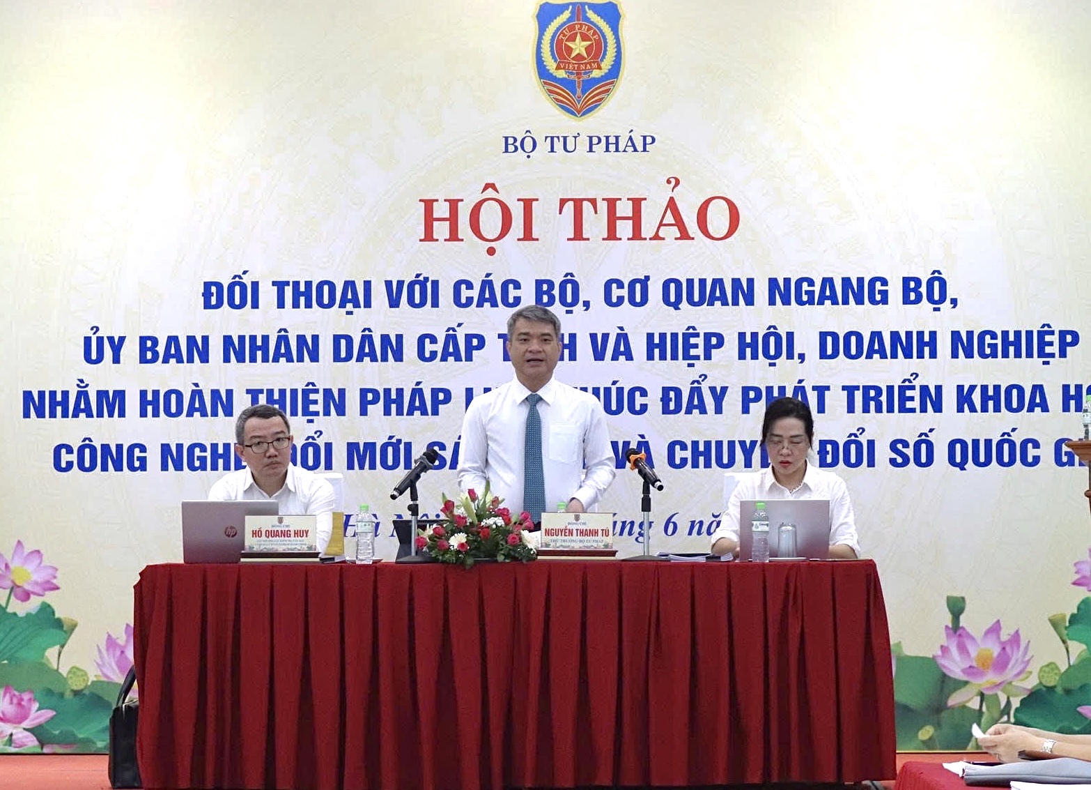 (PLVN) -Ngày 12/6, Bộ Tư pháp tổ chức Hội thảo Đối thoại với các Bộ, cơ quan ngang Bộ, Ủy ban nhân dân cấp tỉnh và hiệp hội, doanh nghiệp nhằm hoàn thiện pháp luật thúc đẩy phát triển khoa học, công nghệ, đổi mới sáng tạo và chuyển đổi số quốc gia. Thứ trưởng Bộ Tư pháp Nguyễn Thanh Tú chủ trì đối thoại.