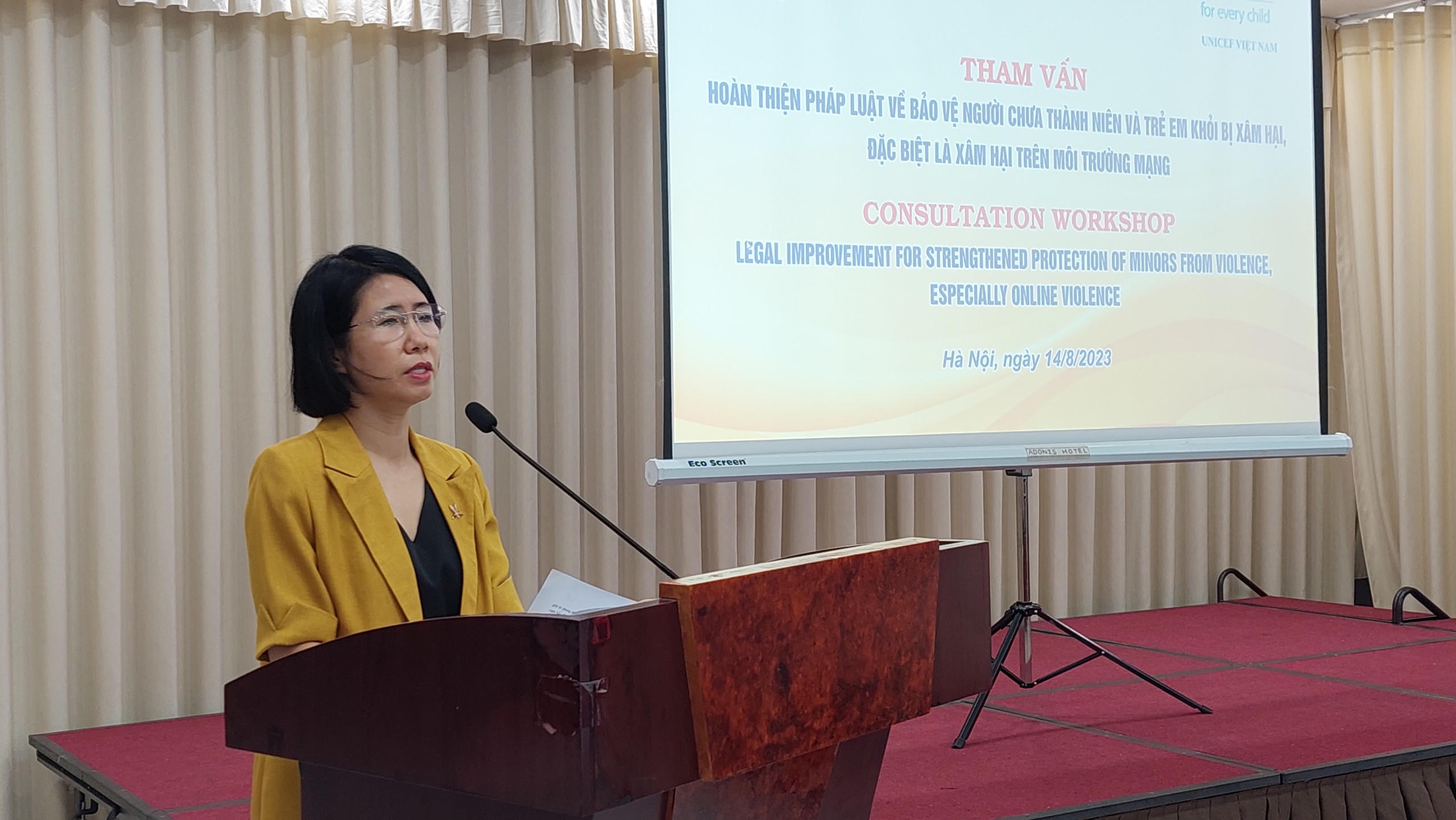 Chủ trì Hội thảo là bà Lê Thị Vân Anh, Phó Vụ trưởng Vụ Pháp luật hình sự hành chính, Bộ Tư pháp; ông Ngô Hoàng, Phó Vụ trưởng Vụ Pháp chế, Bộ Lao động – Thương binh và Xã hội; bà Lê Hồng Loan, Trưởng phòng bảo vệ trẻ em, UNICEF Việt Nam.