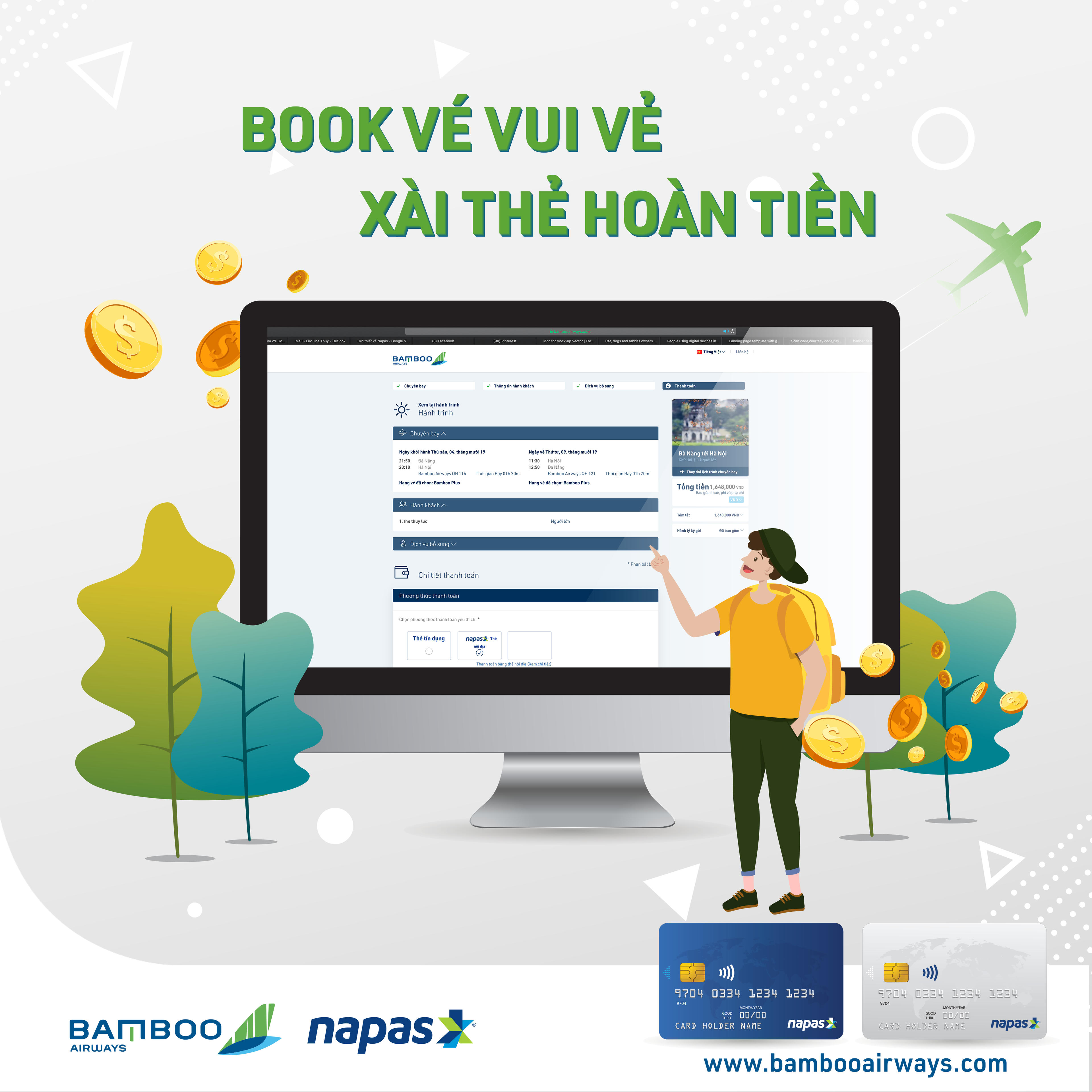 Chương trình ưu đãi “Book vé vui vẻ, xài thẻ hoàn tiền” được Bamboo Airways và Napas phối hợp triển khai từ 10/10/2019 – 31/10/2019. Theo đó, khi đặt vé trực tuyến trên website www.bambooairways.com cho tất cả các chặng bay nội địa mà Hãng đang khai thác, và lựa chọn thanh toán bằng thẻ ngân hàng nội địa có kết nối với cổng thanh toán Napas, khách hàng sẽ được hoàn tiền 200.000 VNĐ với mỗi giao dịch có giá trị từ 2.500.000 VNĐ trở lên.