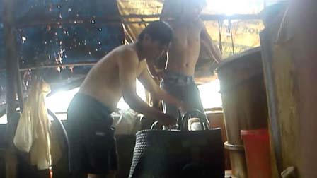 Khoảng 14g cùng ngày, một đầu mối chở hai thùng nhựa chứa lòng heo đã chuyển màu sẫm, bốc mùi hôi thối tới giao cho cơ sở. Hai thợ nấu cao gồm ông Tín (32 tuổi, quê Trà Vinh) và ông Mười (50 tuổi, quê Cần Thơ) hì hục đổ số lòng ra hai chậu ngồi lọc mỡ giữa nền nhà nhoe nhoét nước.