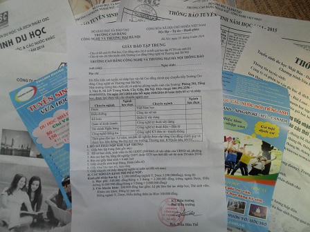 Tại các điểm thi như: ĐH Thủy Lợi, Sư phạm Hà Nội, Quản lý Giáo dục…, các thông báo chiêu sinh được đội ngũ phát tờ rơi rải tận tay người nhà và TS. Nhiều cơ sở giáo dục kèm thông tin quảng cáo trường với giấy “thông báo trúng tuyển”, “thông báo tập trung”…