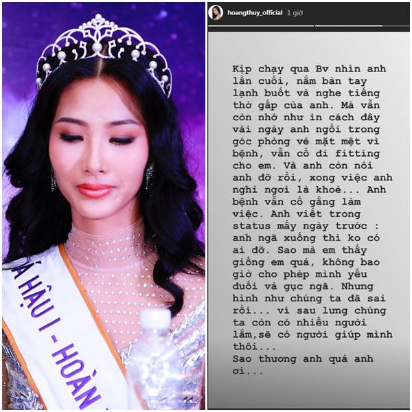 "Mấy hôm nhắn anh: "Sao em sắp quay rồi không có đồ cho em". Anh nhắn: "Anh mệt sáng giờ, chiều anh chạy ra xem đồ cho em liền". Có hôm anh còn chạy xe máy ra đưa đồ cho em. Em nghĩ lại mà thương anh quá. Giờ anh mất rồi, có nói anh cũng chẳng nghe được. Anh an nghỉ nhé, kỷ niệm đẹp mãi ở đó không bao giờ phai", người đẹp Á hậu Hoàn vũ Việt Nam 2017 đau đớn.