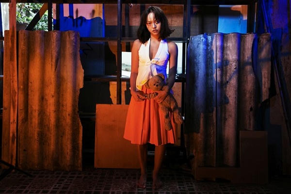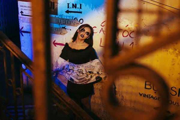 | Lấy bối cảnh một khu chung cư cũ, người mẫu hóa thân thành cô gái đầy ma mị với lối trang điểm u ám. |