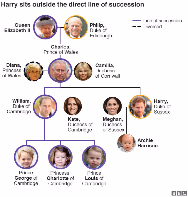 Hoàng tử Harry hiện đứng thứ 6 trong thứ tự kế vị ngai vàng nước Anh. (Đồ họa: BBC)