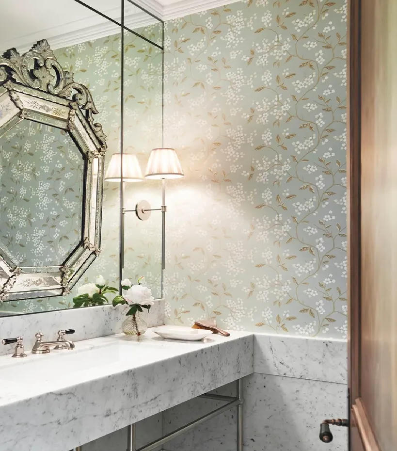6. Bất kể là căn phòng tắm của bạn lớn hay nhỏ thì thiết kế không thể thiếu điểm nhấn. Sử dụng giấy dán tường họa tiết hay gạch ốp sắc màu đều là những lựa chọn tốt. Tuy nhiên, khi sử dụng cho một căn phòng tắm nhỏ, bạn nên lựa chọn giấy dán tường hoặc gạch ốp có màu sắc tươi sáng. Việc này giúp phòng tắm thoáng mát và dễ chịu hơn khi dùng.