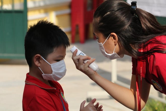 Tại Hà Nội, học sinh được đo thân nhiệt trước khi vào trường. Ảnh do PV Báo Tin tức ghi nhận tại trường Tiểu học Tràng An.