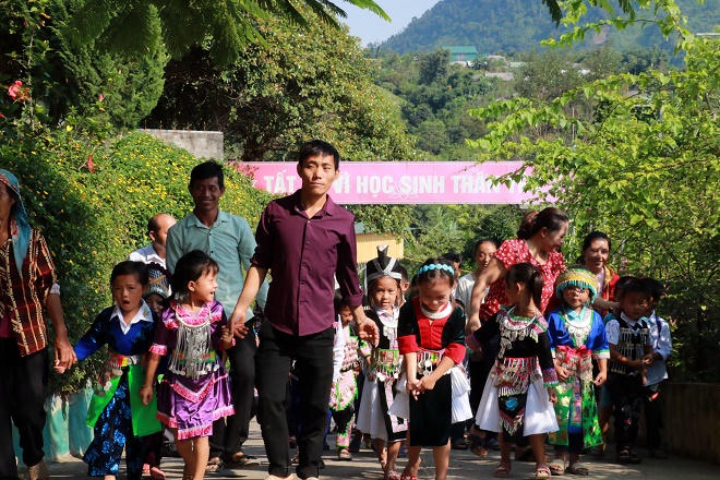Tại Nghệ An, từ sáng sớm, phụ huynh của các bản Khánh Thành, Tiền Tiêu, Noọng Dẻ, Trường Sơn của xã biên giới Nậm Cắn - Kỳ Sơn đã náo nức đến Trường Tiểu học Nậm Cắn 1 để tựu trường cùng với con trẻ. Ảnh Báo Nghệ An.