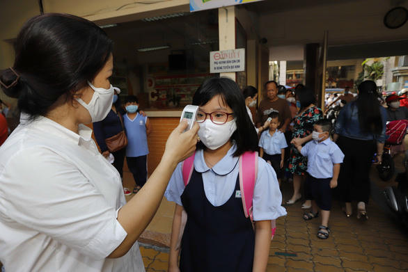 Việc đo thân nhiệt cũng được các thầy cô thực hiện nghiêm túc. Ảnh Tuổi trẻ.