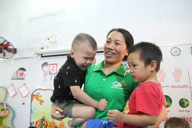 Còn tại TP HCM, một học sinh lớp được dỗ dành khi phải xa ba mẹ để vào lớp cùng giáo viên. Ảnh Tuổi Trẻ.