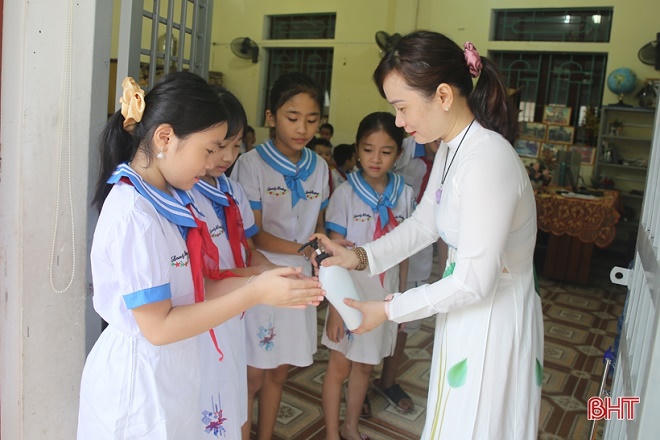 Việc hướng rửa tay sát khuẩn cho học sinh được các giáo viên hướng dẫn nhiệt tình. Ảnh Báo Hà Tĩnh.