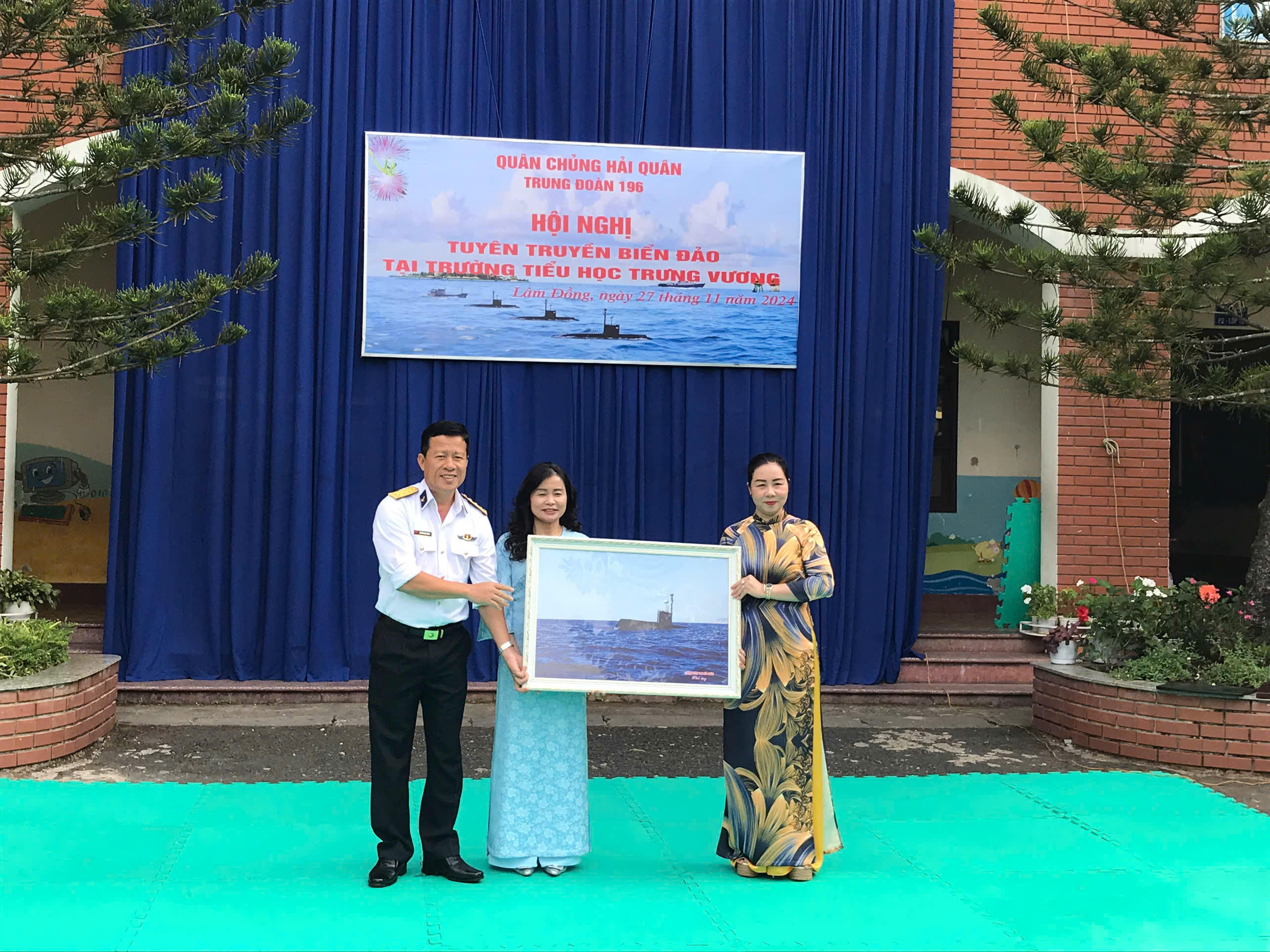 Nhân dịp này, Trung đoàn 196 đã trao tặng ban giám hiệu trường Tiểu học Trưng Vương bức tranh tàu ngầm và 2 cây bàng vuông được đem từ quần đảo Trường Sa về trồng tại khuôn viên nhà trường.