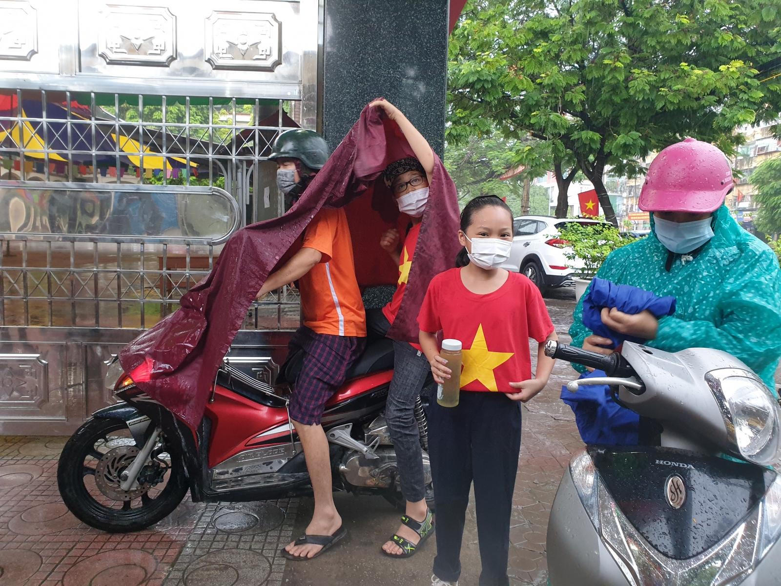 Học sinh lớp 6 Trường THCS Nguyễn Bá Ngọc (Hải Phòng) đến sớm dự lễ khai giảng phải trú mưa. Ảnh: Báo Giáo dục Thời đại.