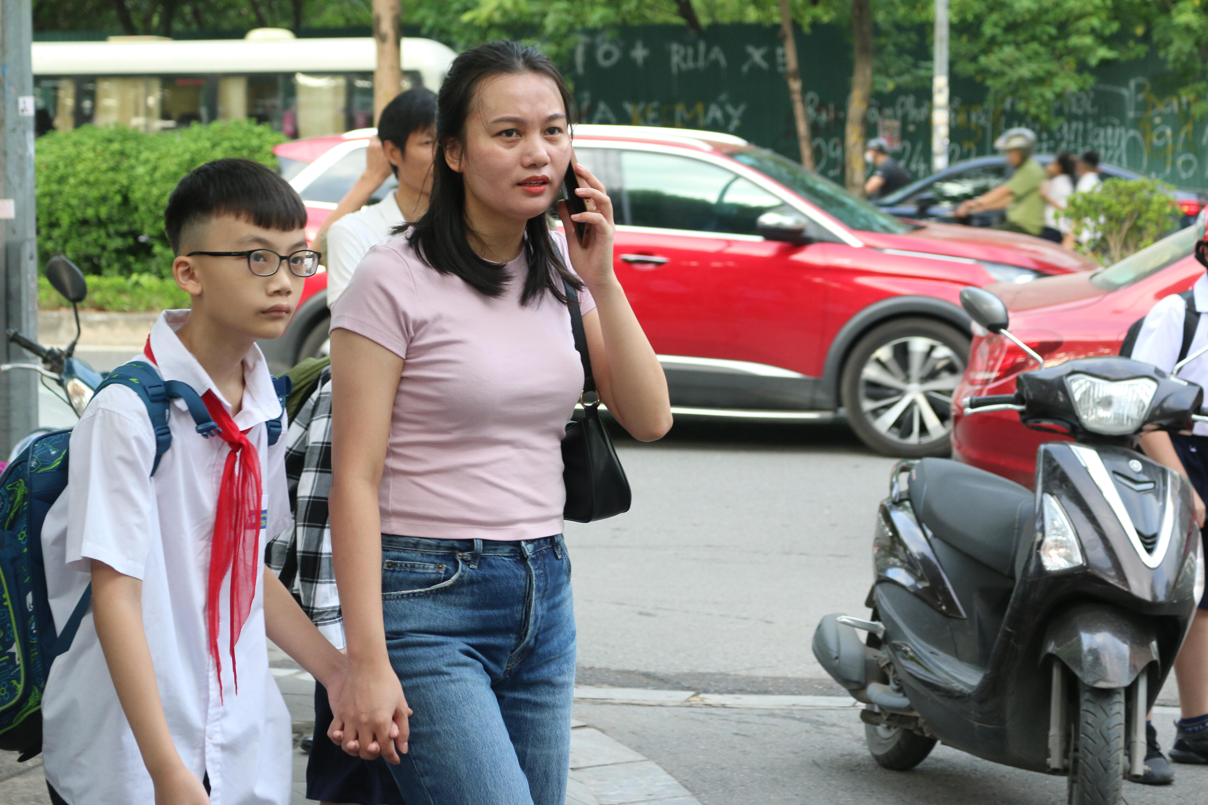 | Nhiều phụ huynh tranh thủ đưa con đến trường trước khi đi làm. |