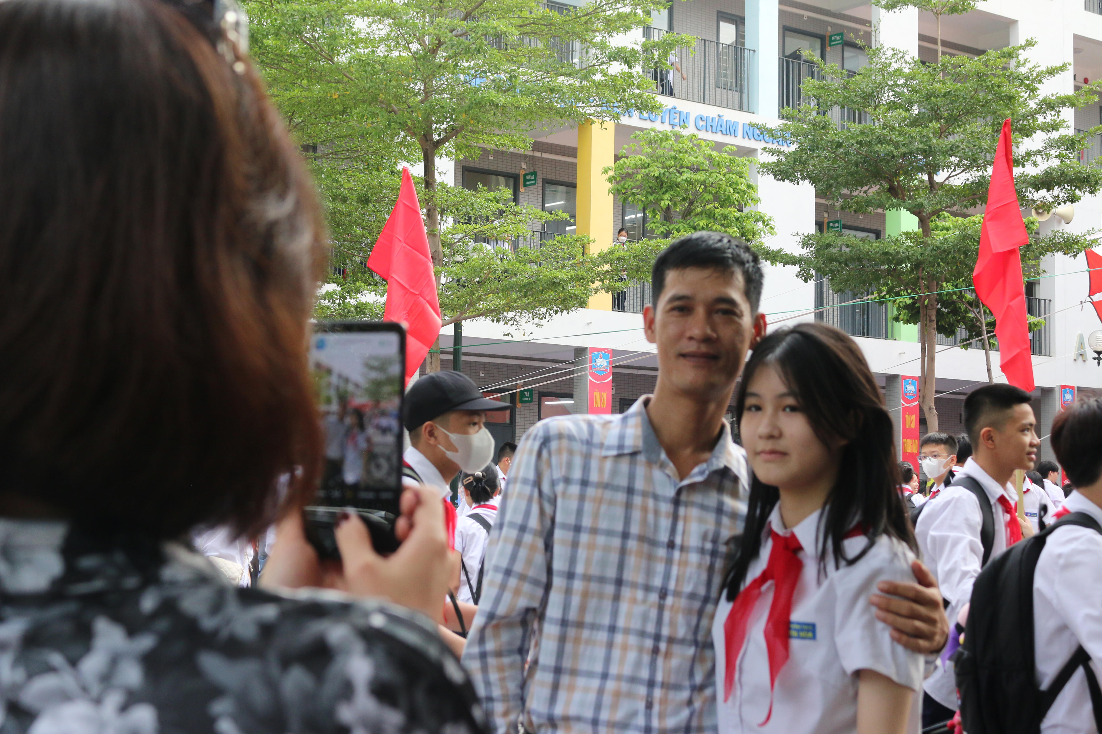 Phụ huynh chụp ảnh lưu niệm cùng con trong ngày khai giảng. |
