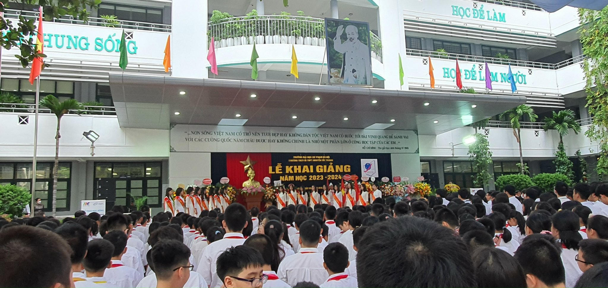 Tại điểm Trường THCS&THPT Nguyễn Tất Thành (Đại học Sư phạm Hà Nội), 2.393 học sinh cùng giáo viên, đại diện cha mẹ học sinh đã làm lễ dâng hoa lên Chủ tịch Hồ Chí Minh trong lễ khai giảng năm học 2023-2024.