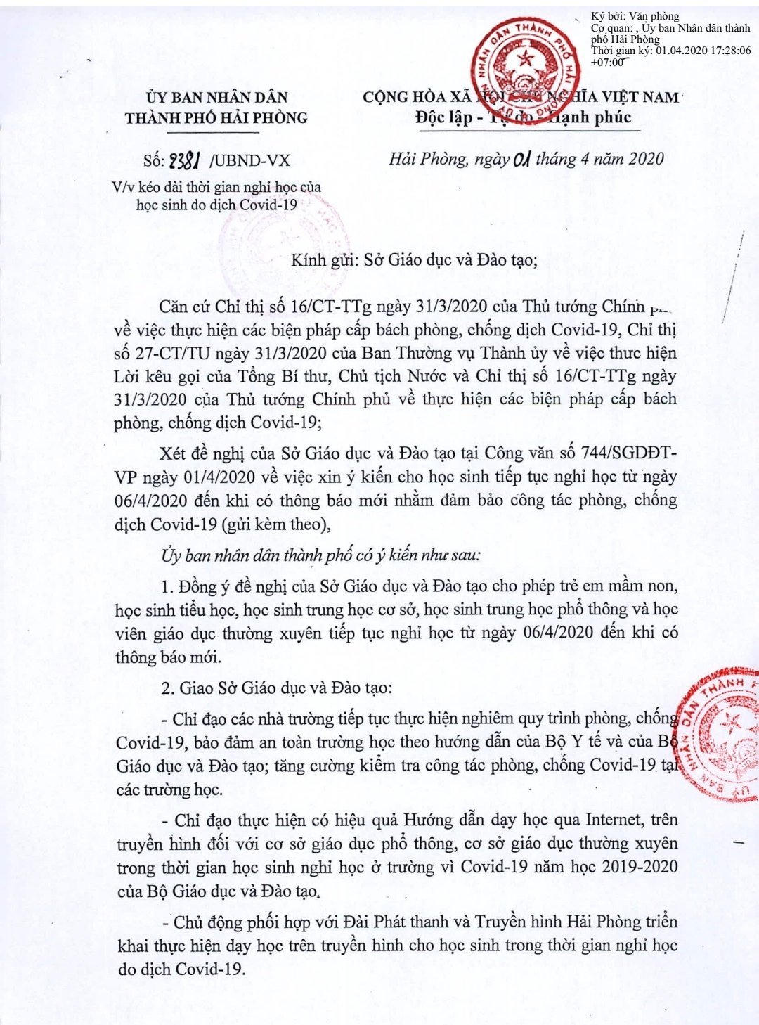 UBND TP Hải Phòng vừa ban hành văn bản đồng ý với đề nghị của Sở Giáo dục và Đào tạo cho phép trẻ em mầm non, học sinh tiểu học, học sinh THCS, học sinh THPT và học viên giáo dục thường xuyên tiếp tục nghỉ học từ 6/4/2020 đến khi có thông báo mới.