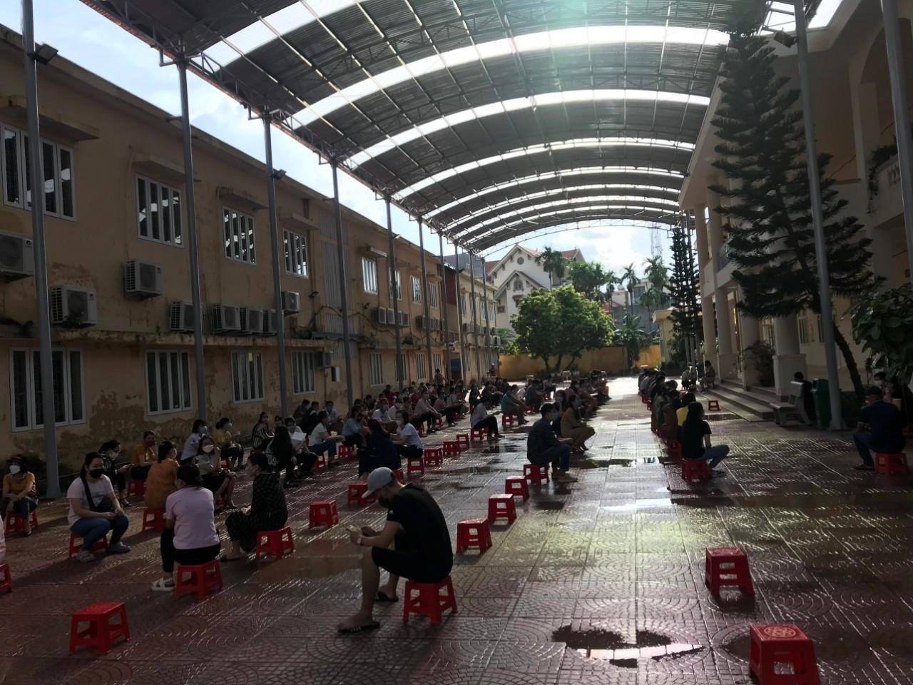 Phụ huynh học sinh Trường Tiểu học An Dương, huyện An Dương giữ khoảng cách trong giờ đợi con. |