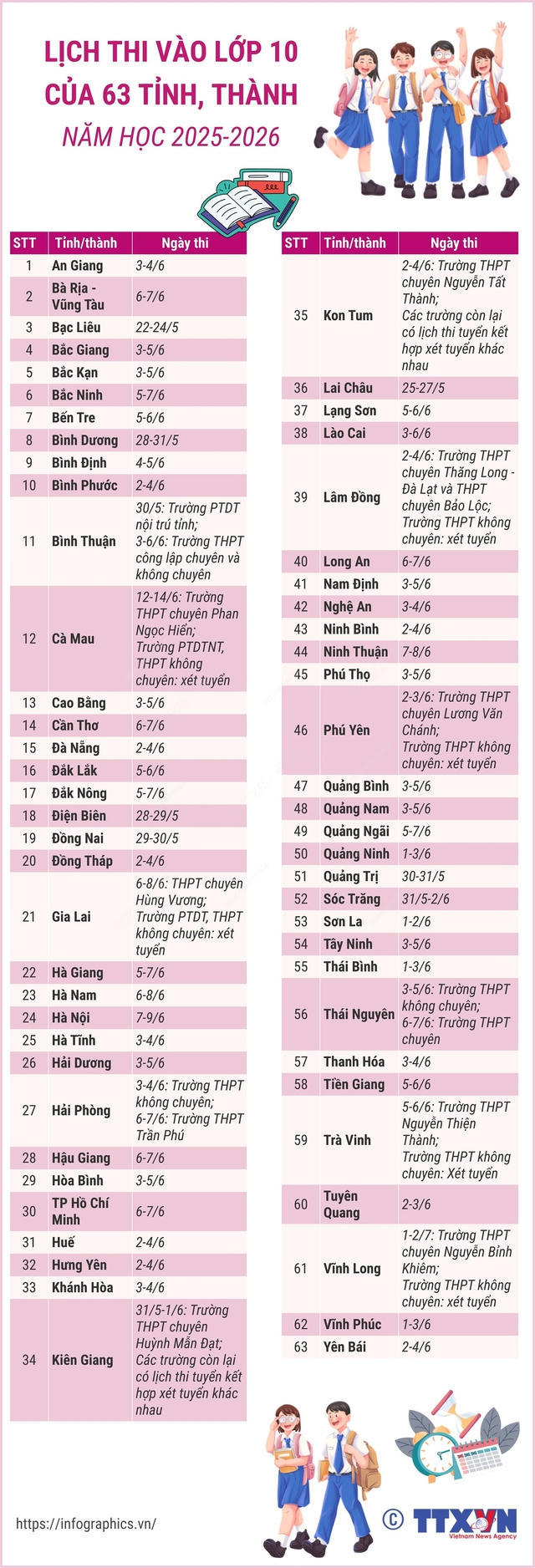 Đến thời điểm hiện tại, đa số các địa phương trên cả nước đã công bố lịch thi vào lớp 10 THPT công lập. Trong đó, có 4 địa phương là Cà Mau, Gia Lai, Vĩnh Long và Lâm Đồng sử dụng phương thức xét tuyển lớp 10 dựa trên kết quả học tập THCS và các tiêu chí khác.