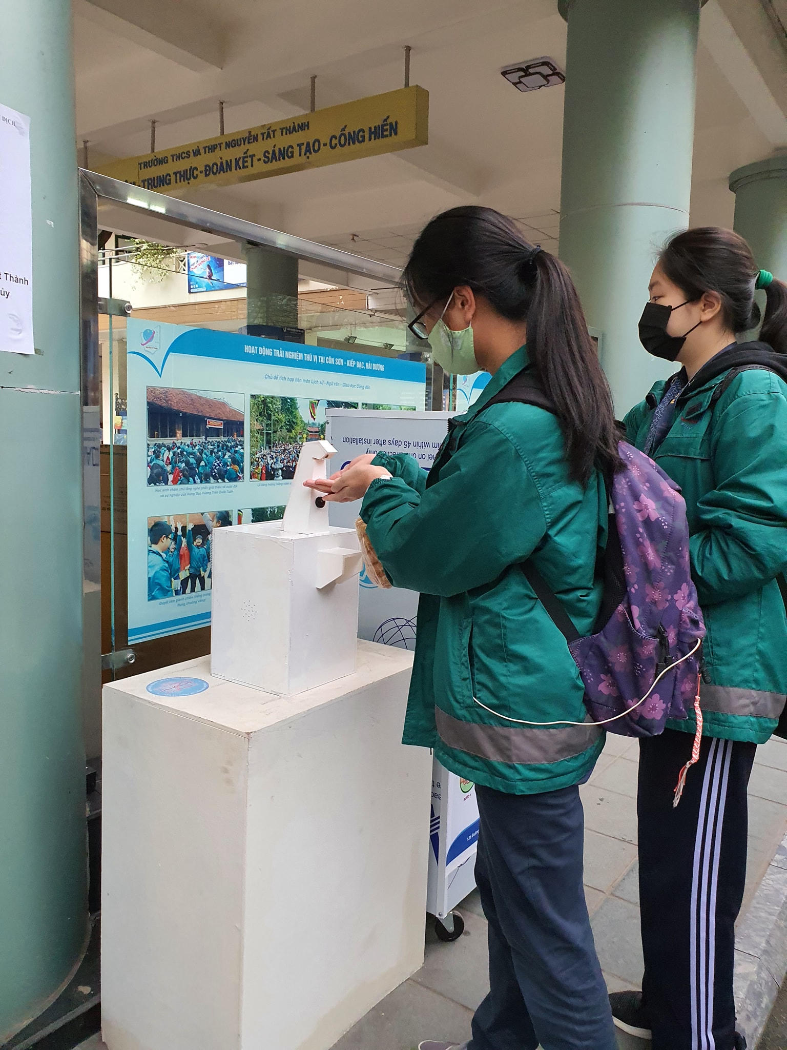 Robot rửa tay tự động được đưa vào sử dụng cho học sinh trường Nguyễn Tất Thành có 3 hệ thống chính (nhắc rửa tay, rửa tay tự động và đo nhiệt độ cơ thể). Nguyễn Tiến Mạnh và Dương Nhật Minh lớp 11A1 tác giả của robot rửa tay tự động chia sẻ thời gian hoàn thành sản phẩm của các em kéo dài 3, 4 tháng kể từ khi xuất hiện ý tưởng.
