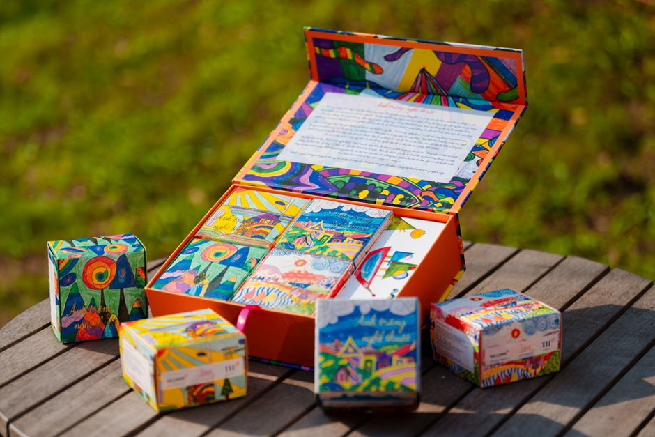 Góc trưng bày dự án Bánh trung thu gây quỹ từ thiện của Quỹ Vì Tầm Vóc Việt, sử dụng tác phẩm của học sinh TH School