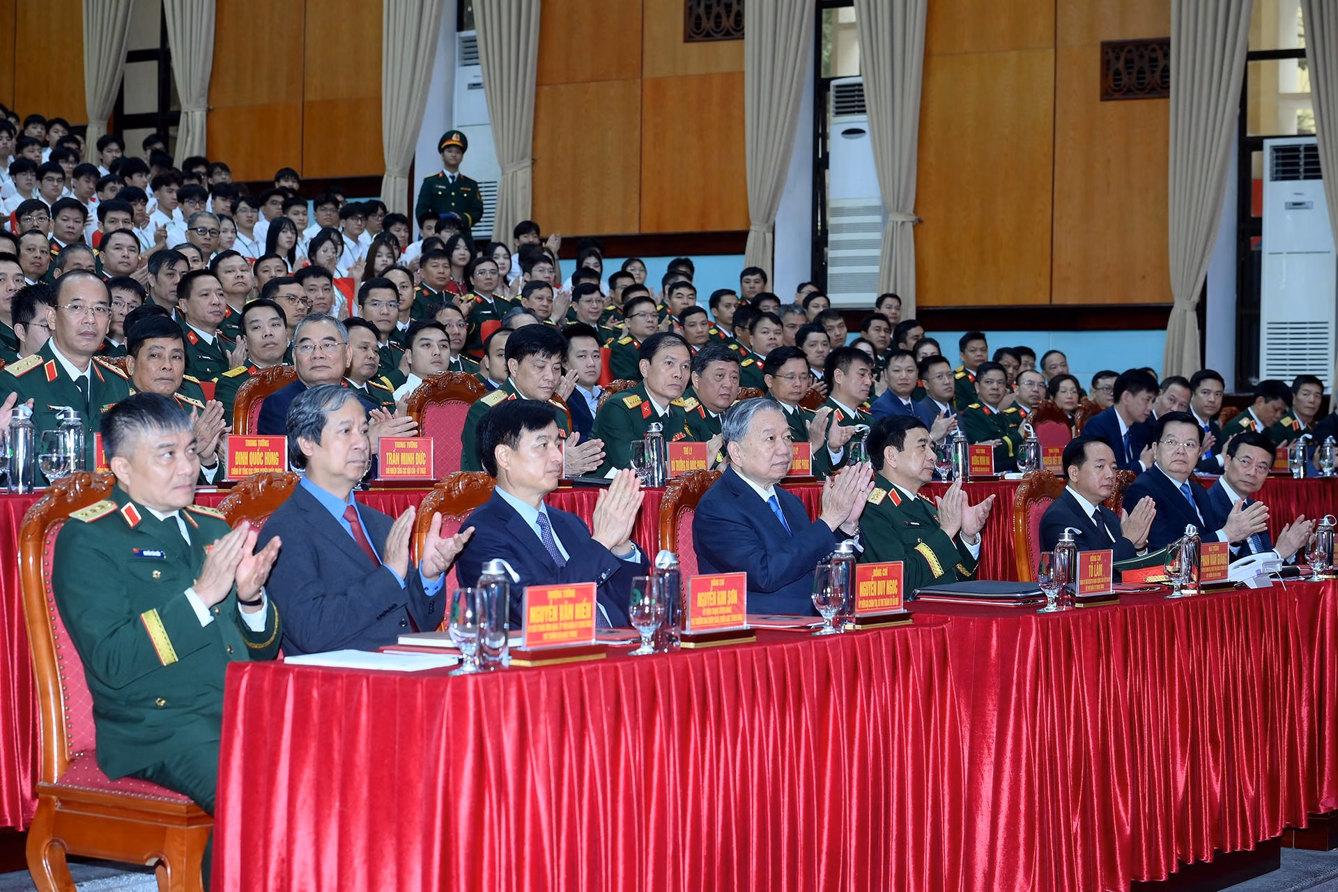 Thay mặt lãnh đạo Đảng, Nhà nước, Tổng Bí thư Tô Lâm chúc mừng, ghi nhận và biểu dương toàn thể cán bộ, giảng viên, nhân viên, học viên, sinh viên, chiến sĩ toàn Học viện về những kết quả, thành tích đã đạt được trong thời gian qua.