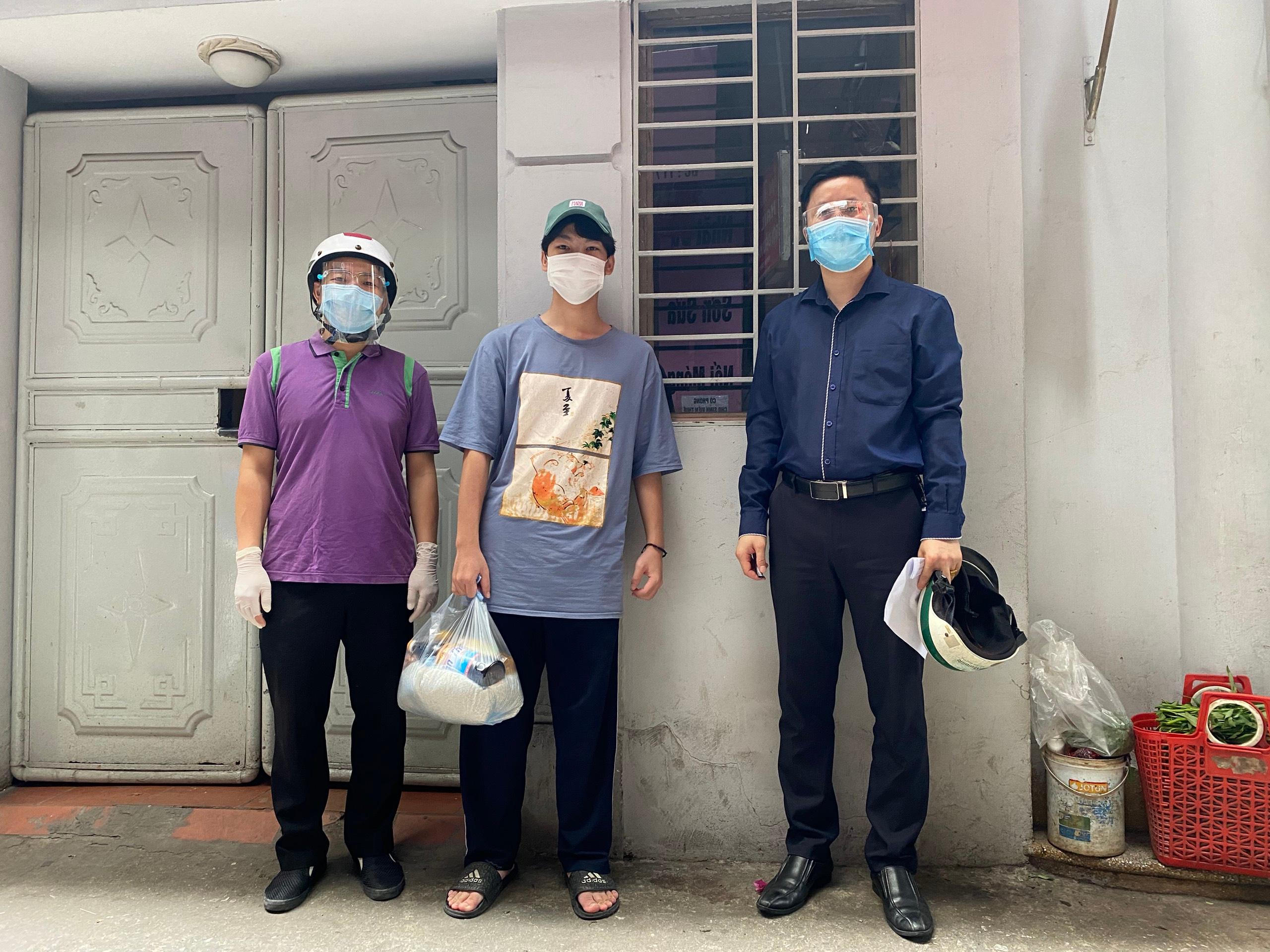 Đại diện Phòng Công tác sinh viên và Đoàn thanh niên Học viện cùng đơn vị tài trợ trao tặng nhu yếu phẩm trực tiếp cho sinh viên trên địa bàn Hà Nội |