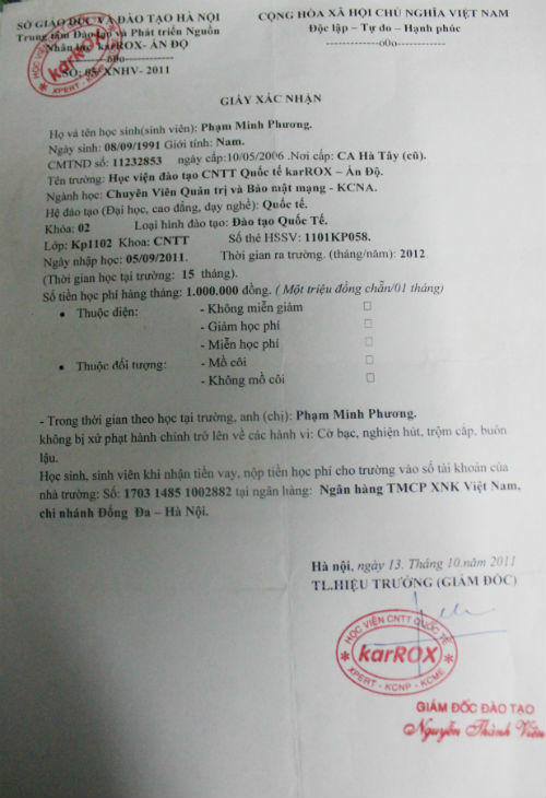 Theo trình bày của anh Phạm Minh Phương (Trung Hòa, Chương Mỹ, Hà Nội), anh nhập học tại Học viện CNTT Quốc tế Karrox Ấn Độ vào tháng 9/2011, hệ đào tạo "Chuyên viên Quản trị và Bảo mật mạng" khóa học 2011 - 2013. "Thời gian đầu, phía học viện vẫn đào tạo chúng tôi theo đúng cam kết nhưng sau một thời gian, học viên chúng tôi được chuyển từ số 239 Cầu Giấy sang cơ sở mới là số 18 Nguyễn Chí Thanh (Hà Nội)" - anh Phạm Minh Phương cho biết.