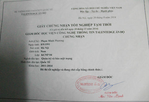| "Giấy chứng nhận tốt nghiệp tạm thời" do ông Mai Văn Mạnh - Giám đốc Học viện CNTT Quốc tế Talentedge - Ấn Độ cấp ngày 20/8/2014 cho học viên. |