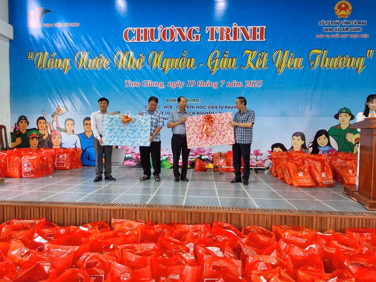 Tại buổi lễ, các thành viên trong đoàn và đại diện cấp ủy, chính quyền địa phương đã trao tặng kinh phí xây nhà tình nghĩa trị giá 80 triệu đồng cho đồng chí Kiên Sang, là chuyên viên Văn phòng Sở Tư pháp Cà Mau, người dân tộc Khmer có hoàn cảnh đặc biệt khó khăn; Trao tặng cho các hộ gia đình thương binh liệt sĩ, chính sách, người có công cách mạng; các gia đình có hoàn cảnh khó khăn và học sinh nghèo, vượt khó, hiếu học tại địa phương 01 máy cắt cỏ cho thanh niên vượt khó khởi nghiệp; 75 phần quà gồm tiền mặt và nhu yếu phẩm, đồ dùng học sinh, cá nhân thường ngày với tổng giá trị gần 250.000.000 đồng.