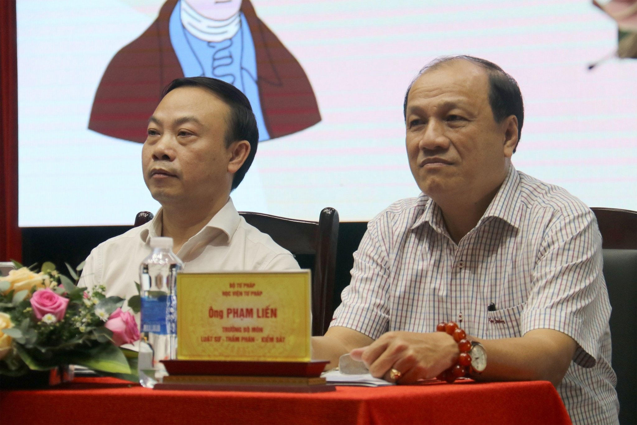 Giám đốc Học viện Tư pháp Nguyễn Xuân Thu (bên trái) tại Tọa đàm. |