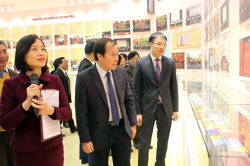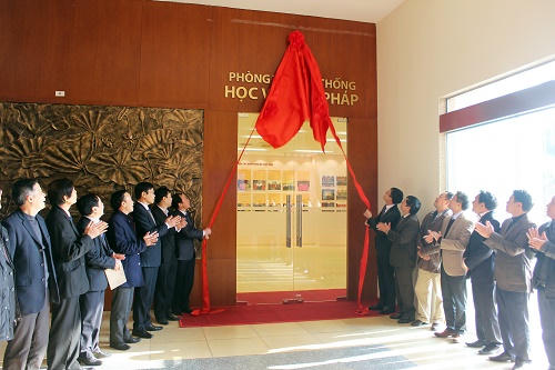 | Thứ trưởng Bộ Tư pháp Lê Tiến Châu và Giám đốc Học viện Tư pháp Đoàn Trung Kiên kéo băng khánh thành phòng truyền thống. |