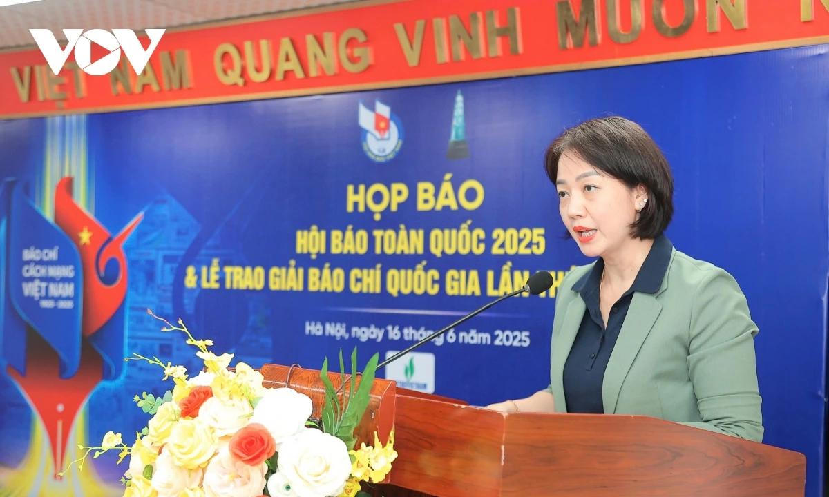 Bà Lê Mỹ Ái Linh - Quyền Giám đốc Trung tâm văn hóa báo chí, Phó Trưởng ban Thường trực Hội báo toàn quốc năm 2025 thông tin tại buổi họp báo (Ảnh: VOV) |