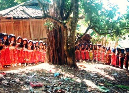 Riêng phụ nữ thì họ phải đội trên đầu từ 3 - 5 chiếc áo mới của dân tộc để cúng cho người chết. Khi tiếng trống cất lên cũng là lúc thầy cúng tiến hành vào lễ, lúc này con cháu bắt đầu múa hát. Lời hát là nỗi thương tiếc, cầu mong cho người đã khuất quay về đoàn tụ với tổ tiên, phù hộ cho họ sự bình yên.