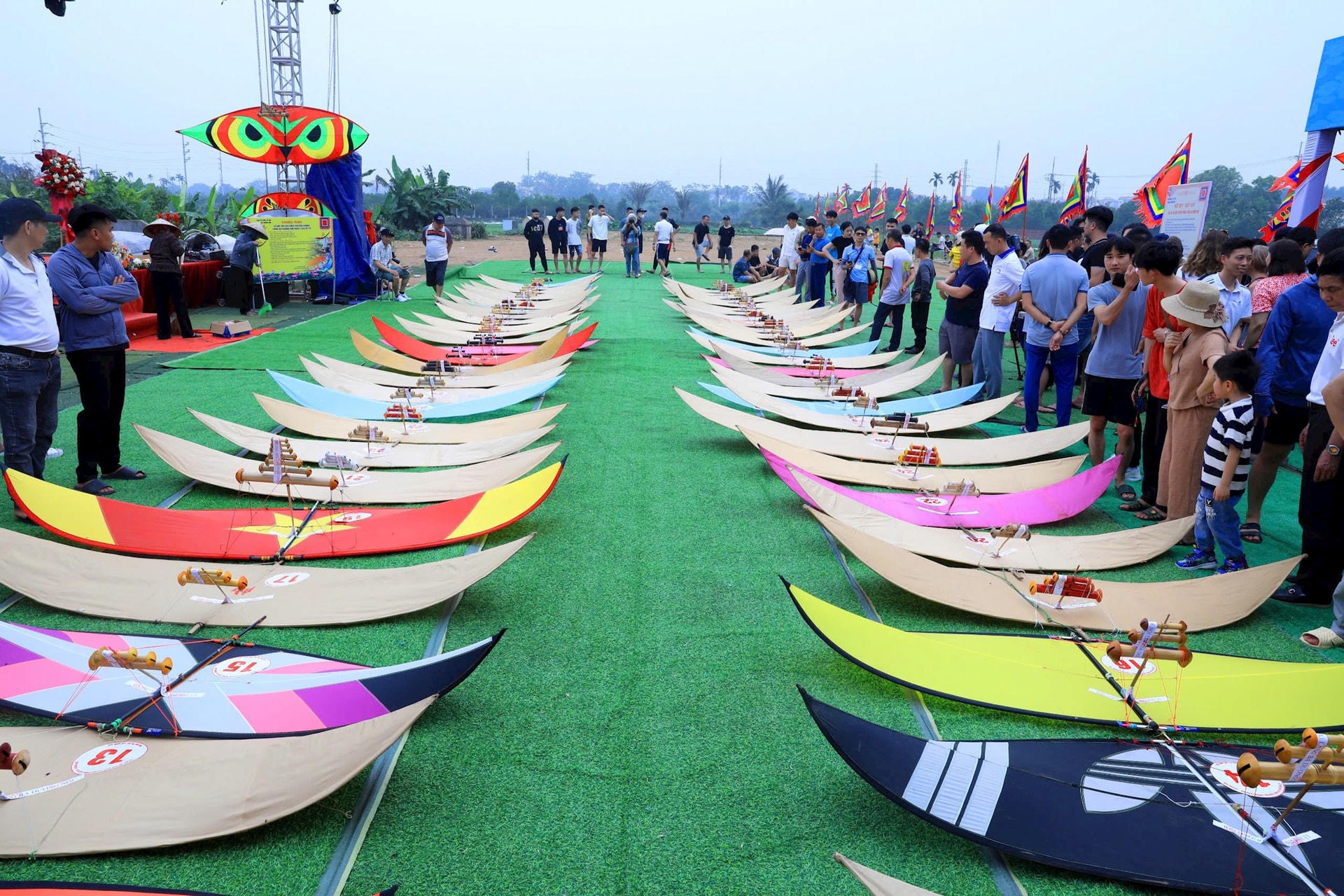Những con diều đủ tiêu chuẩn được đánh số thứ tự, chuẩn bị tham gia thi. |