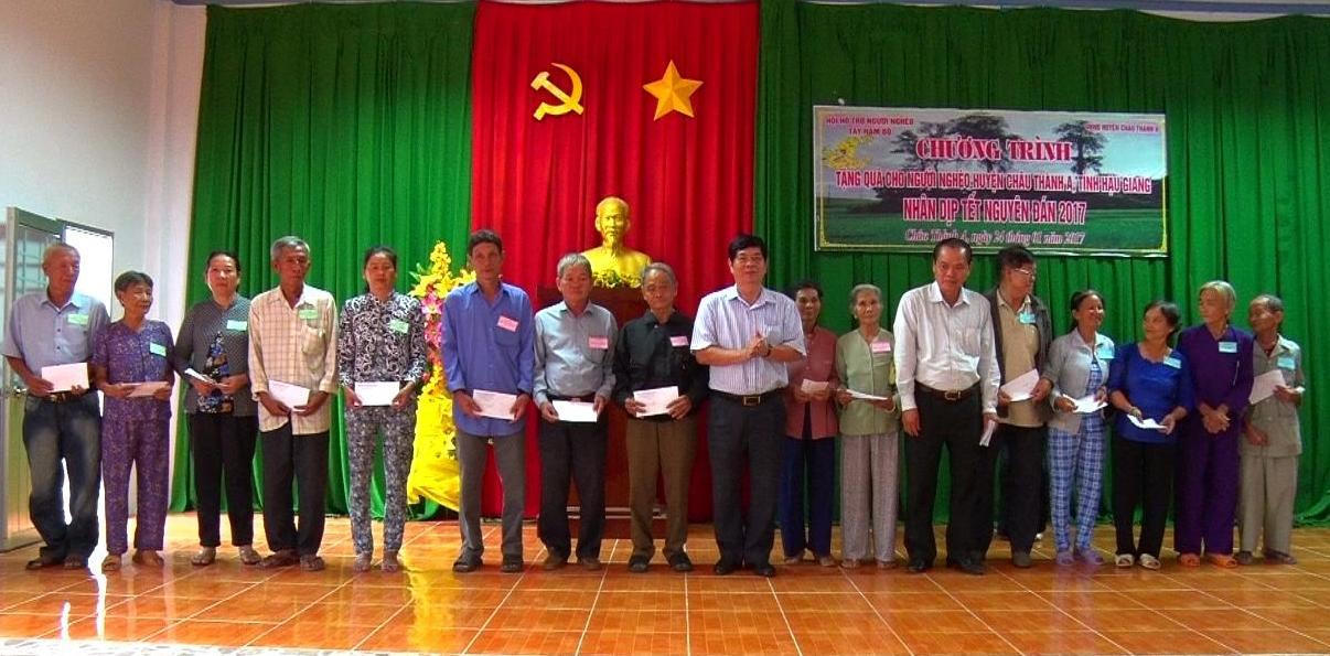 (PLO) -Ngày 24/1, Hội Hỗ trợ nghèo Tây Nam bộ phối hợp với UBND huyện Châu Thành A, tỉnh Hậu Giang tổ chức Chương trình trao tặng 150 suất quà Tết (mỗi phần quà trị giá 400.000 đồng) cho các hộ gia đình chính sách, gia đình có hoàn cảnh khó khăn, các hộ nghèo và cận nghèo trên địa bàn 3 xã: Trường Long (huyện Phong Điền, TP. Cần Thơ); Trường Long A, Trường Long Tây (huyện Châu Thành A, tỉnh Hậu Giang) nhân dịp Tết Nguyên đán Đinh Dậu 2017.