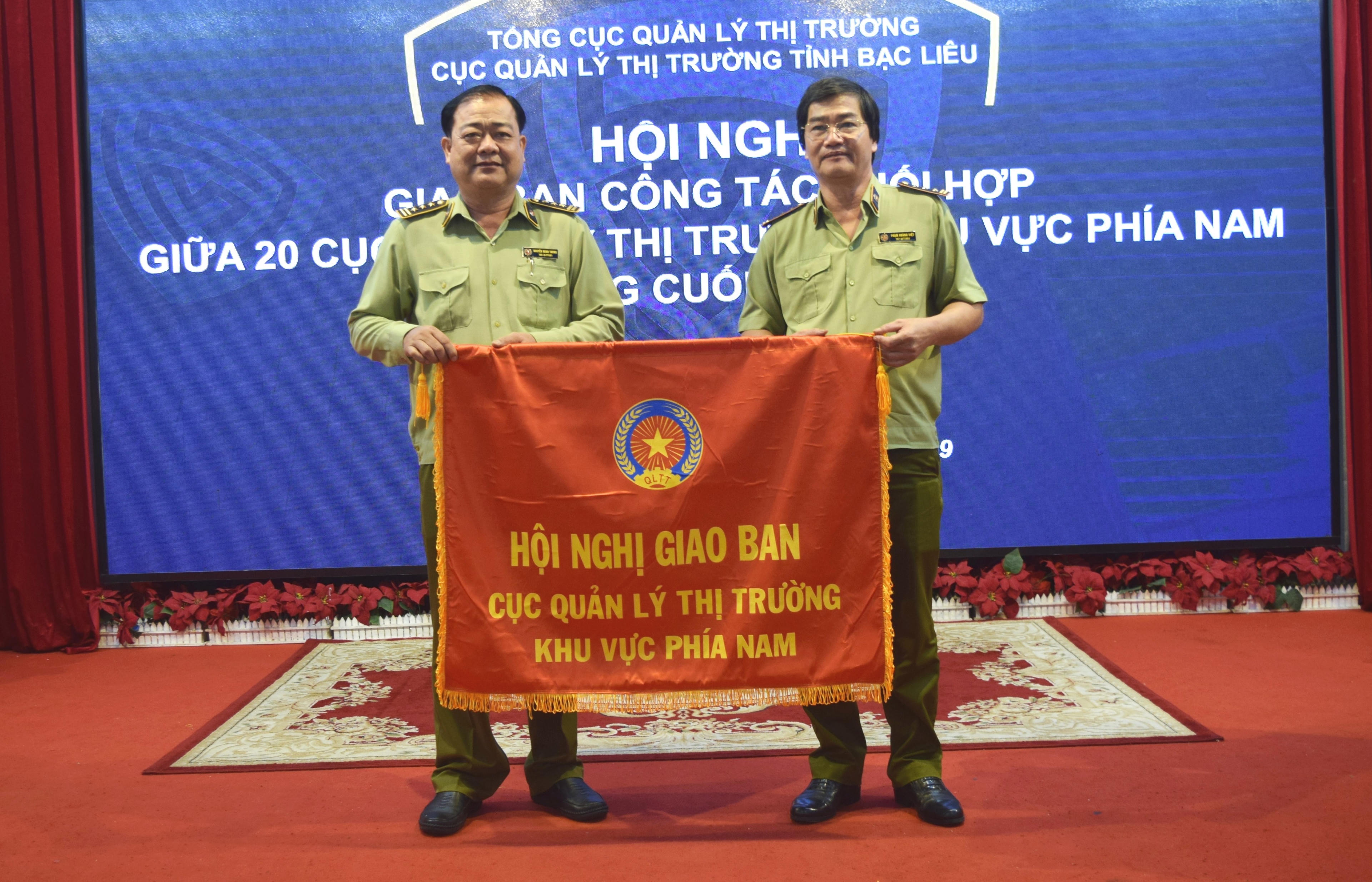 Ông Nguyễn Minh Trung - Cục trưởng Cục QLTT Bạc Liêu (bên trái, từ phải qua) trao cờ luân phiên tổ chức Hội nghị giao ban công tác phối hợp giữa 20 Cục QLTT phía Nam cho ông Phạm Hoàng Việt – Cục trưởng Cục QLTT tỉnh Trà Vinh