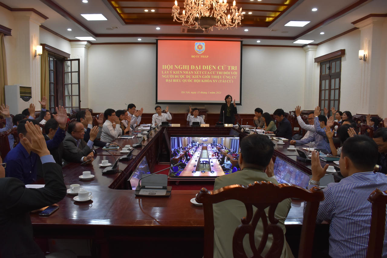 (PLVN) -Ngày 11/3, Bộ Tư pháp đã tổ chức Hội nghị Lãnh đạo Bộ dự kiến giới thiệu người ứng cử Đại biểu Quốc hội (ĐBQH) khóa XV (tái cử); Hội nghị lấy ý kiến cử tri đối với người được dự kiến giới thiệu ứng cử ĐBQH khóa XV (tái cử) và Hội nghị Lãnh đạo Bộ mở rộng giới thiệu người ứng cử ĐHQH khoá XV (tái cử).