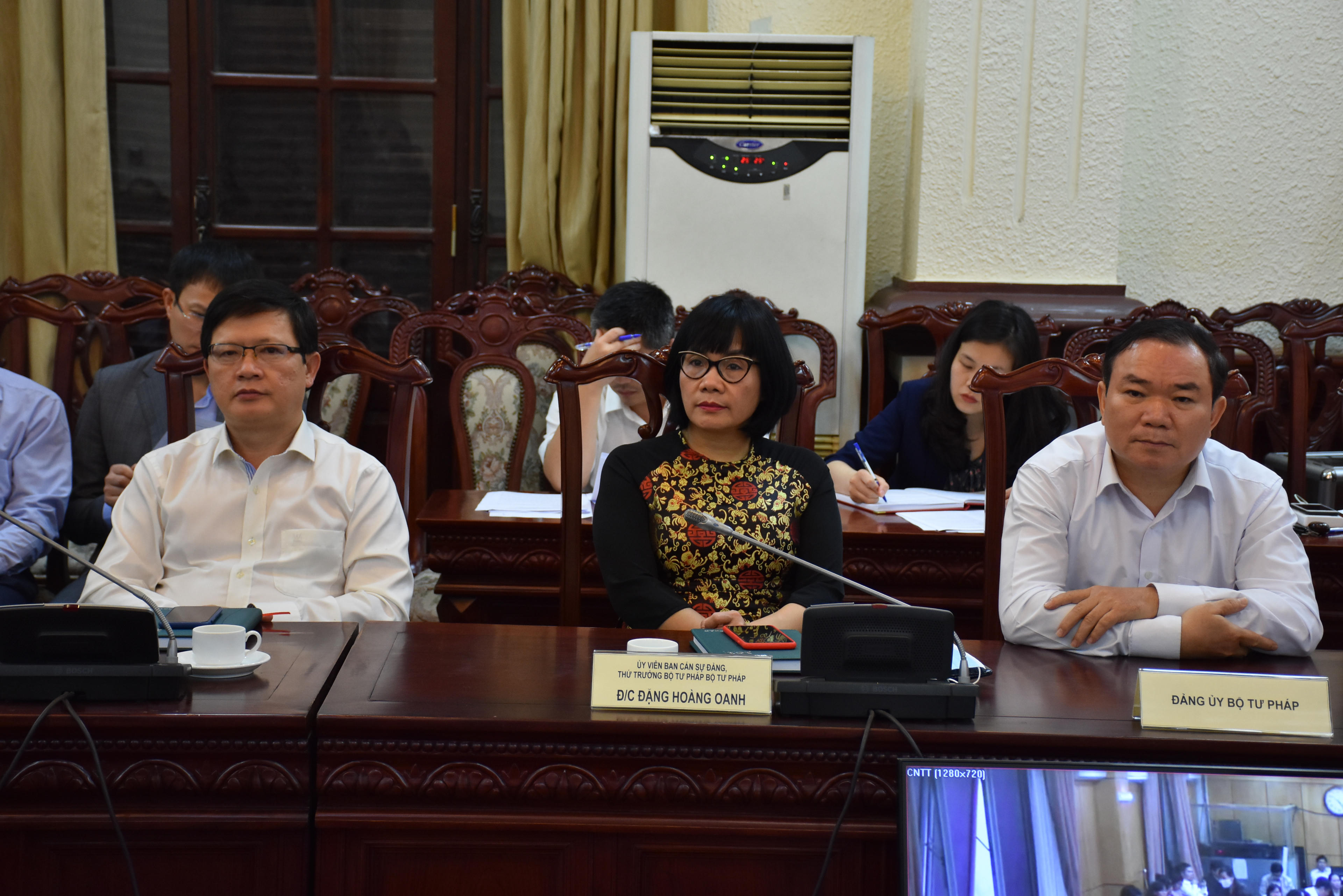 Đồng chí Nguyễn Khánh Ngọc, Phó Bí thư Ban cán sự Đảng, Thứ trưởng Bộ Tư pháp và đồng chí Khương Thị Thanh Huyền, Ủy viên BCH Đảng bộ Bộ, Chủ tịch Công đoàn Bộ chủ trì Hội nghị. Cùng tham dự có Bộ trưởng Lê Thành Long, các Thứ trưởng: Phan Chí Hiếu, Đặng Hoàng Oanh, Nguyễn Thanh Tịnh, Mai Lương Khôi.