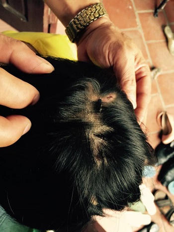 Khi bé Ph. được đưa ra, những người dân tham gia “giải cứu” cháu bé không khỏi bàng hoàng, thương xót. Vết thương trên trán bé Ph. vẫn còn rỉ nước vàng. Không những vậy, khắp người bé Ph. còn chằng chịt vết thương, có cái đã đóng vẩy, có cái còn dang rỉ nước vàng…
