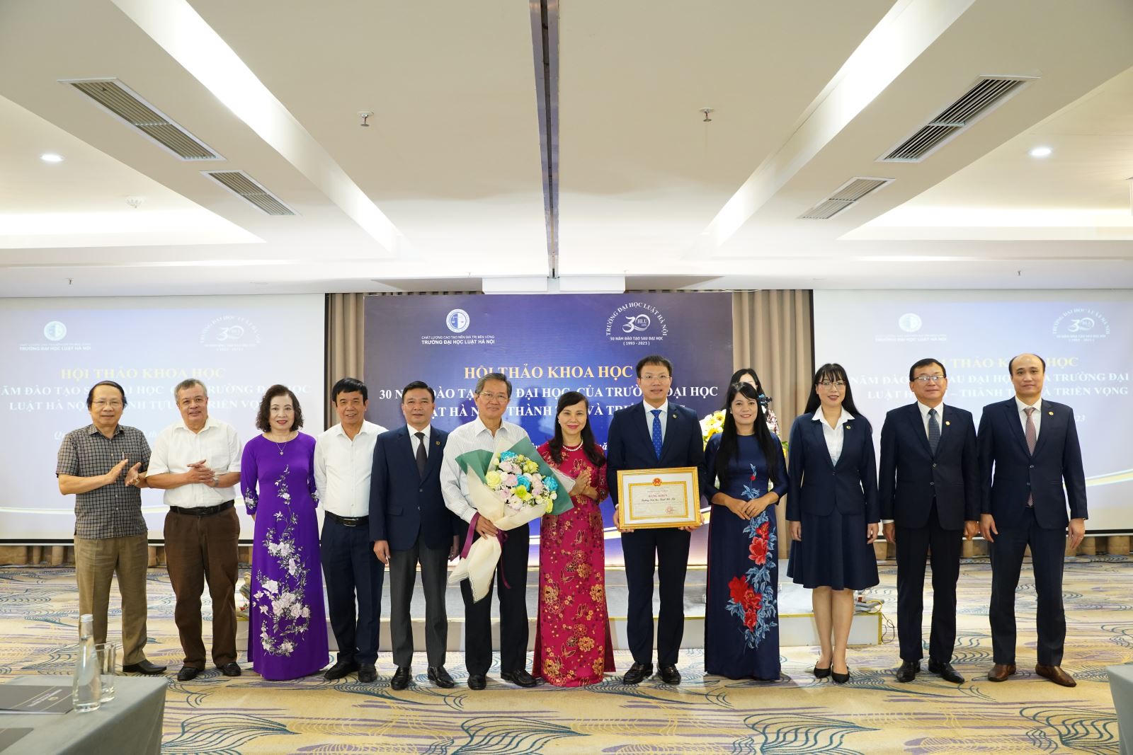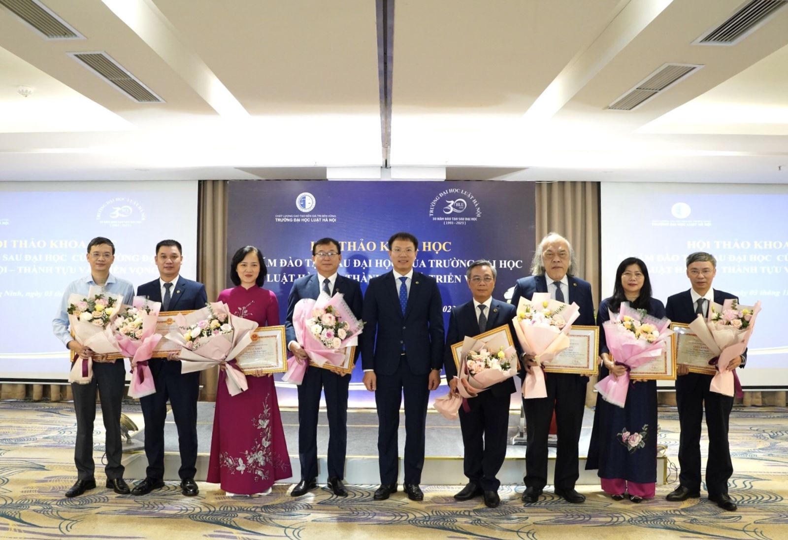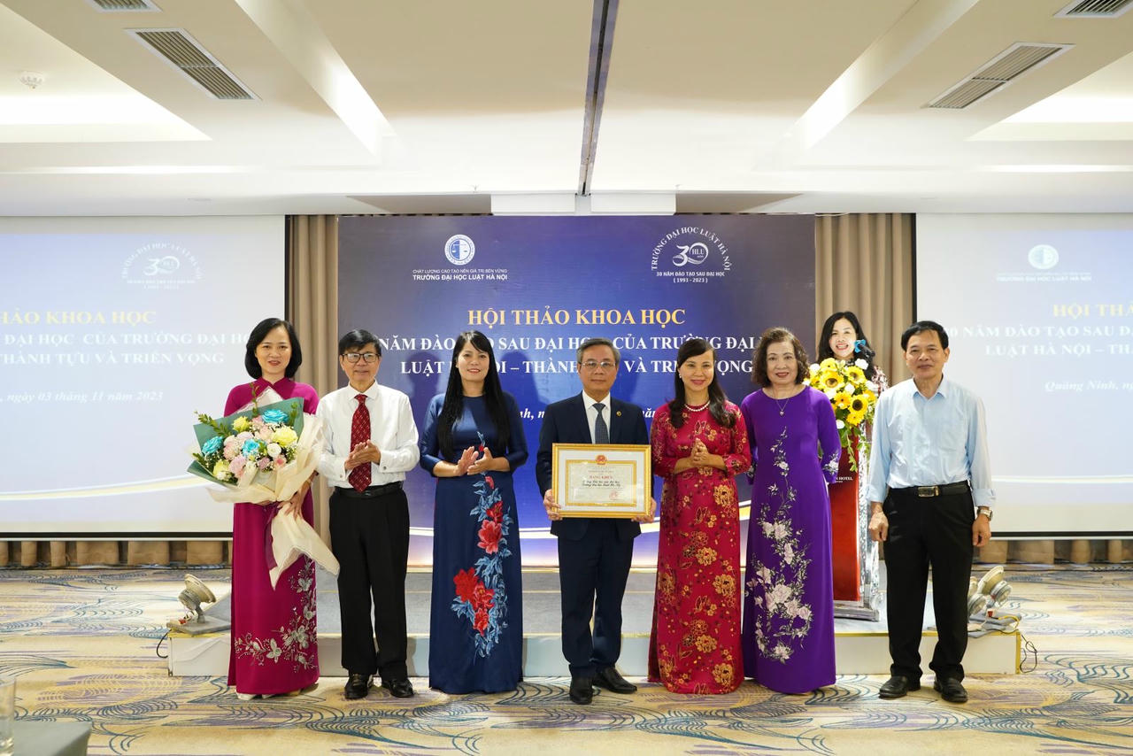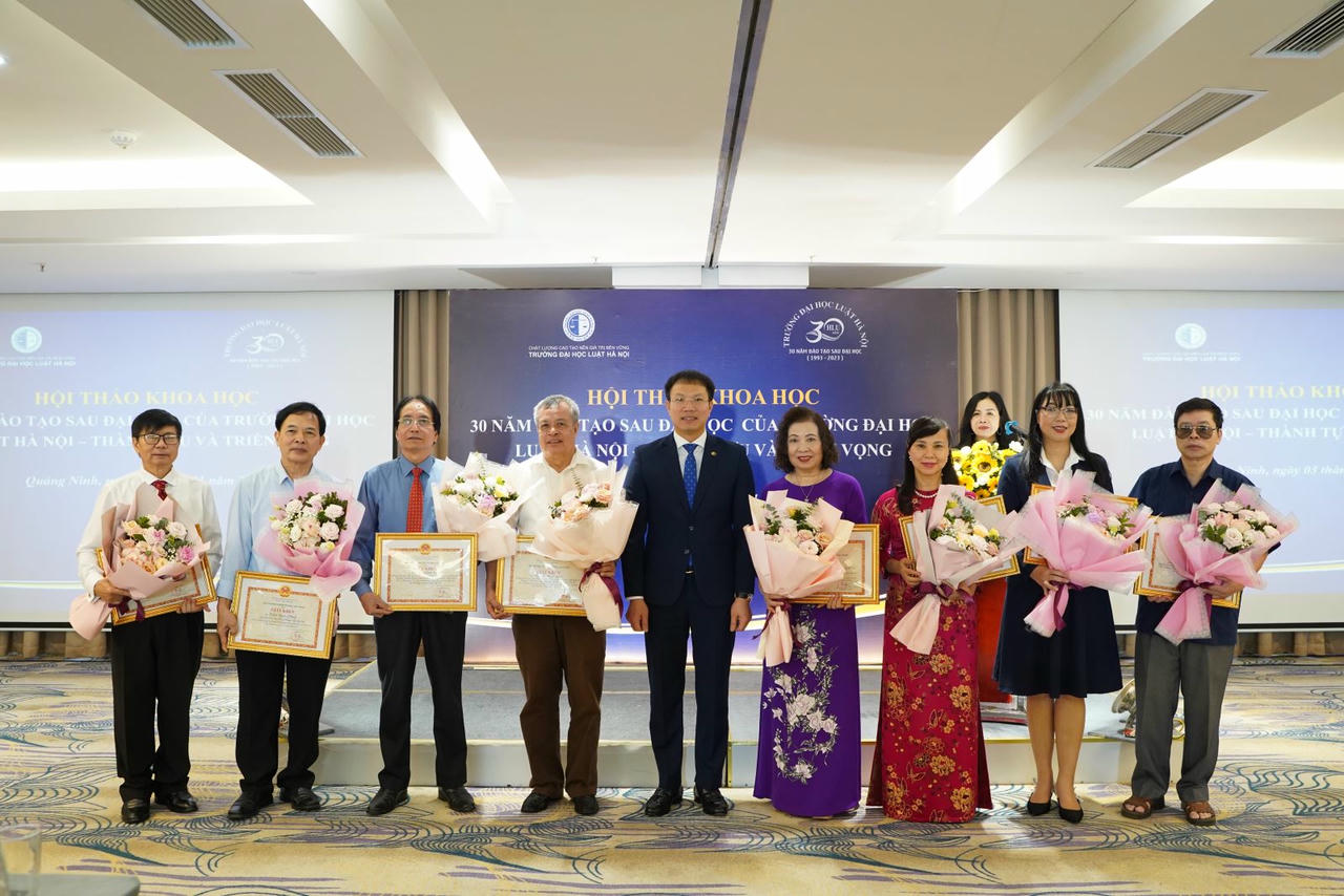 Để ghi nhận những kết quả đạt được sau 30 năm đào tạo sau đại học, nhân dịp này Bộ trưởng Bộ Tư pháp đã quyết định trao tặng Bằng khen cho 02 tập thể là Trường Đại học Luật Hà Nội và Phòng Đào tạo sau đại học, đồng thời Hiệu trưởng cũng có quyết định tặng Giấy khen 09 tập thể và 31 cá nhân có thành tích trong công tác đào tạo sau đại học của Nhà trường. Nhân dịp này, Hiệu trưởng Đoàn Trung Kiên gửi lời cảm ơn Ban Cán sự Đảng, Lãnh đạo Bộ Tư pháp và cá nhân đồng chí Bộ trưởng, Thứ trưởng Đặng Hoàng Oanh đã luôn quan tâm lãnh đạo, chỉ đạo các mặt công tác của Trường, trong đó có công tác đào tạo sau đại học; trân trọng cảm ơn Bộ Giáo dục và Đào tạo và các đơn vị thuộc Bộ, các cơ quan, đơn vị, đối tác đã luôn tạo điều kiện thuận lợi cho Trường hoàn thành các nhiệm vụ được giao.