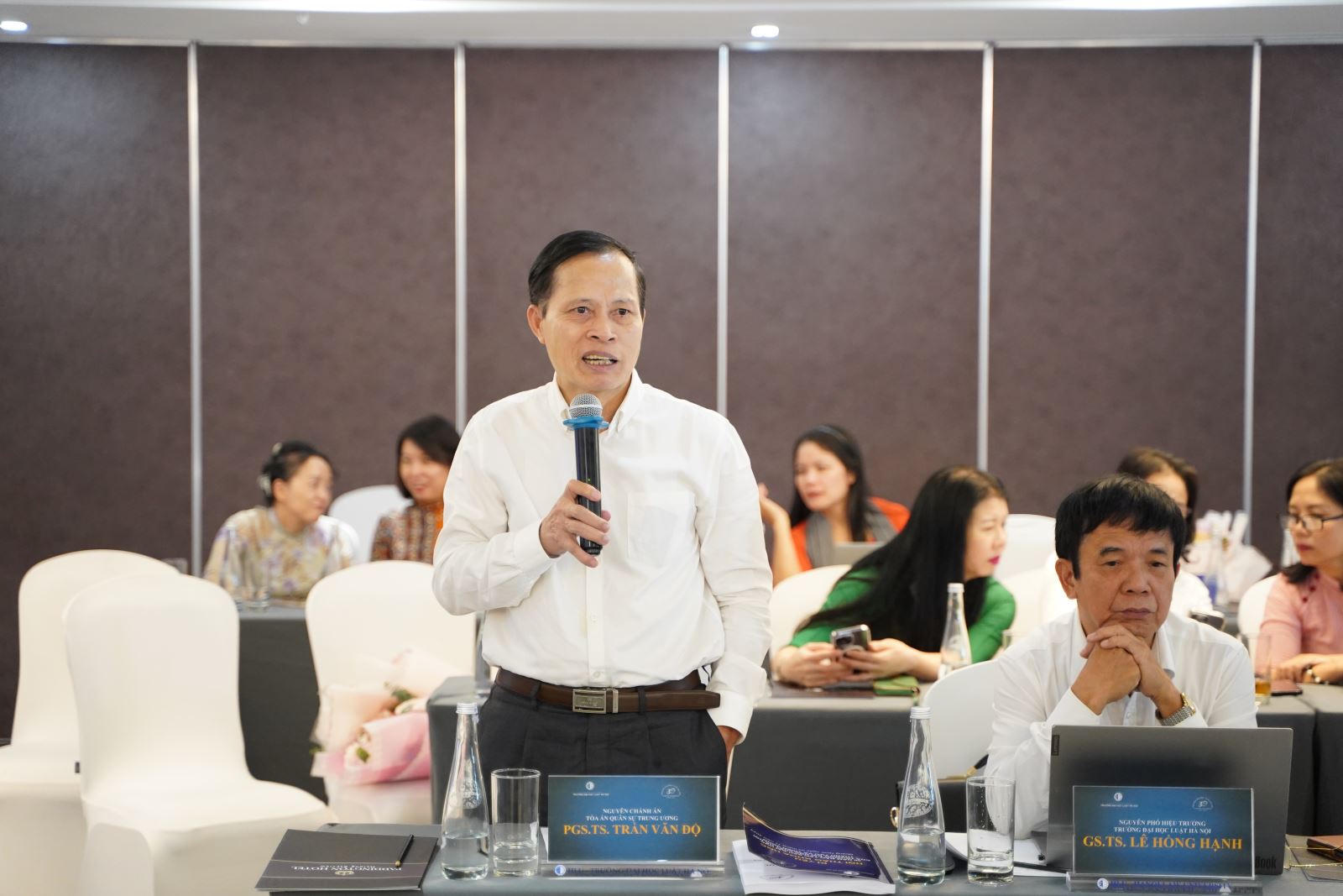 Bên cạnh đó hội thảo còn có sự tham dự của các thầy cô nguyên lãnh đạo: GS.TS Lê Minh Tâm - Nguyên Phó Chủ tịch kiêm Tổng thư ký Hội luật gia Việt Nam, Nguyên Hiệu trưởng Nhà trường; GS.TS Lê Hồng Hạnh - Tổng Biên tập Tạp chí Pháp luật và Phát triển, Viện trưởng Viện Pháp luật và Kinh tế ASEAN, Nguyên Phó Hiệu trưởng; GS.TS Nguyễn Ngọc Hoà - Nguyên Phó Hiệu trưởng, Giảng viên cao cấp Khoa Pháp luật hình sự; GS.TS Lê Thị Sơn - Nguyên Phó hiệu trưởng Nhà trường; PGS.TS Trương Quang Vinh - Nguyên Phó Hiệu trưởng phụ trách; TS. Luật sư Nguyễn Thị Kim Phụng - Giám đốc Trung tâm Kiểm định chất lượng giáo dục Thăng Long - Nguyên Vụ trưởng Vụ Giáo dục Đại học, Nguyên Phó Hiệu trưởng Nhà trường.