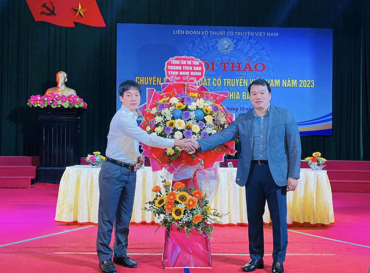 Ông Đỗ Đình Điểm - Giám đốc trung tâm thể thao thành tích cao tỉnh Nam Định tặng hoa chúc mừng hội thảo |