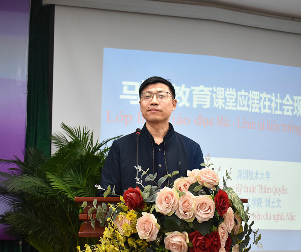 | Đồng chí Lưu Sĩ Văn, Phó Viện trưởng Học viện Chủ nghĩa Mác, Đại học Kỹ thuật Thâm Quyến tham luận với chủ đề: “Bối cảnh xã hội - Lớp học chủ nghĩa Mác” |