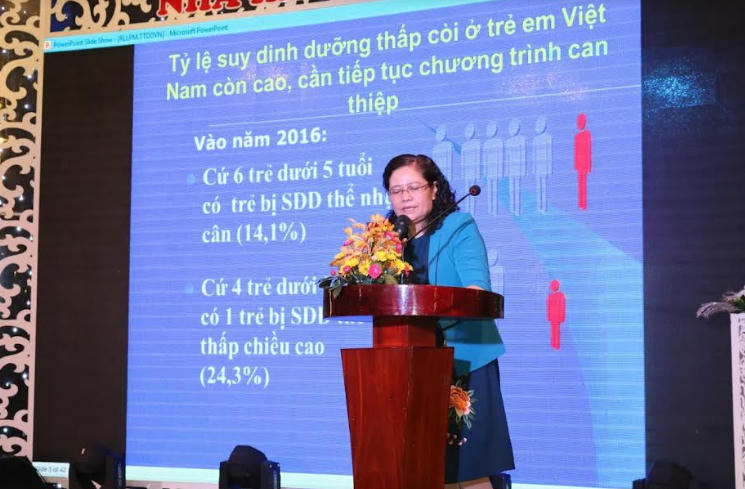 | PGS.TS.BS Nguyễn Thị Lâm - Nguyên Phó Viện trưởng Viện Dinh dưỡng Quốc gia trình bày bài tham luận Thực trạng bệnh liên quan dinh dưỡng và giải pháp can thiệp tại Hội thảo |