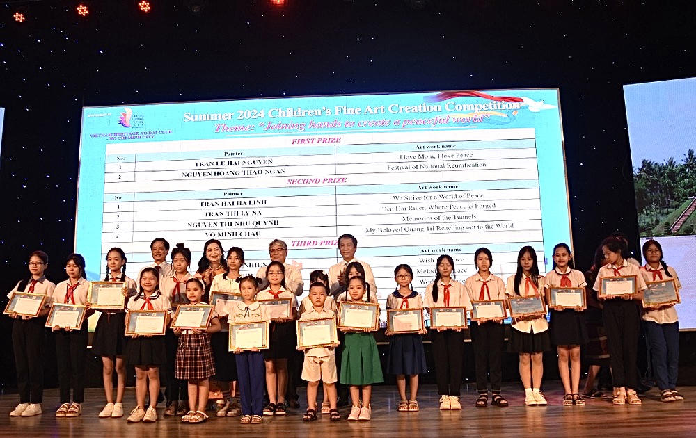 Cũng trong sáng 22/7, trong khuôn khổ Hội thảo quốc tế 'Bài học về hòa bình, nhìn từ thực tiễn Việt Nam' diễn ra tại TP Đông Hà, Trung tâm Hoạt động Thanh thiếu niên tỉnh phối hợp với Liên hiệp các Tổ chức hữu nghị tỉnh Quảng Trị và nhà tài trợ là Câu lạc bộ Di sản áo dài Việt Nam - TP. Hồ Chí Minh tổ chức trao giải cuộc thi vẽ tranh với chủ đề 'Chung tay kiến tạo hòa bình'.