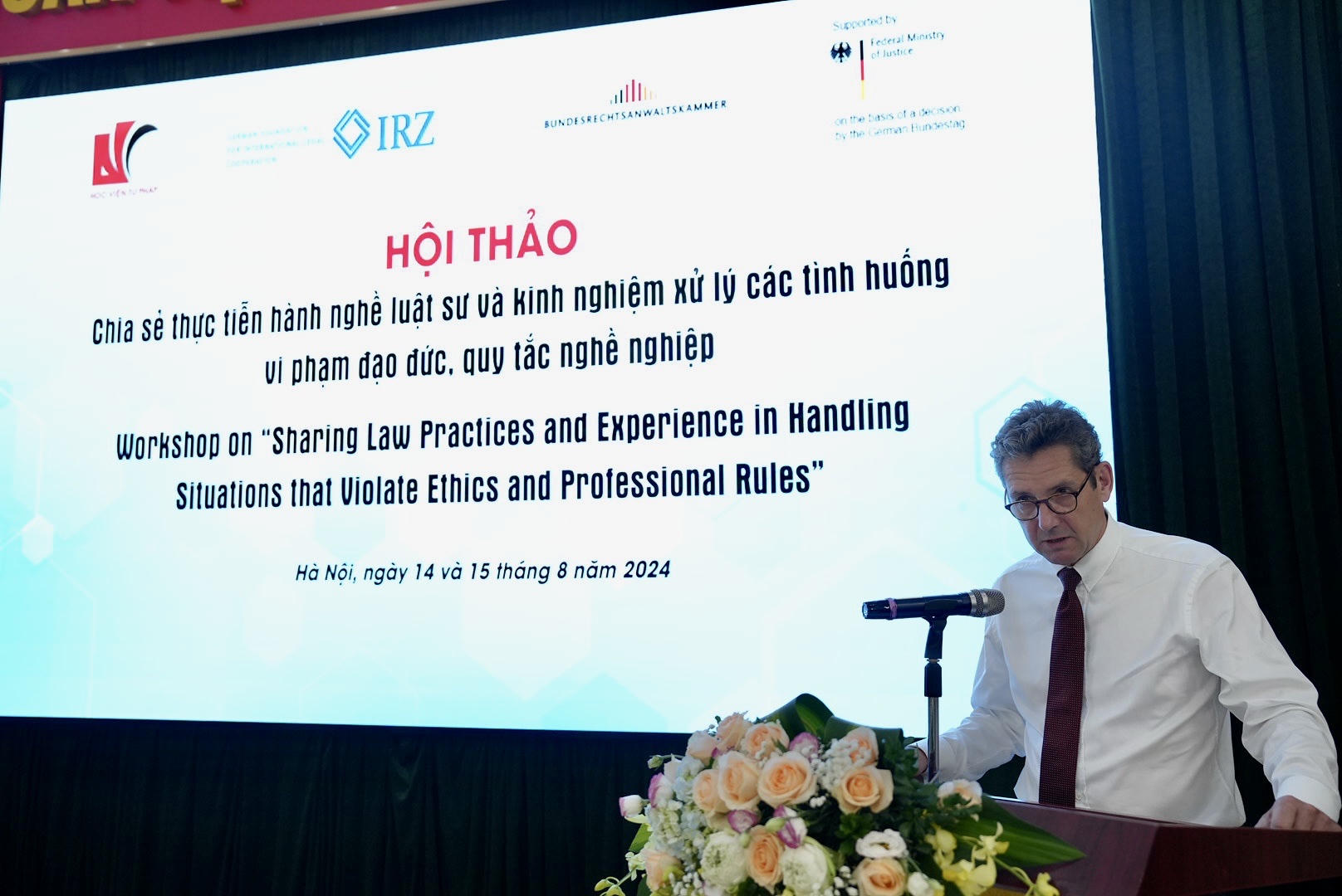 (PLVN) -Sáng 14/8, Học viện Tư pháp, Viện Hợp tác quốc tế Đức về pháp luật và Đoàn Luật sư liên bang, Cộng hòa Liên bang (CHLB) Đức cùng phối hợp tổ chức hội thảo “Chia sẻ thực tiễn hành nghề luật sư và kinh nghiệm xử lý các tình huống vi phạm đạo đức, quy tắc nghề nghiệp”.