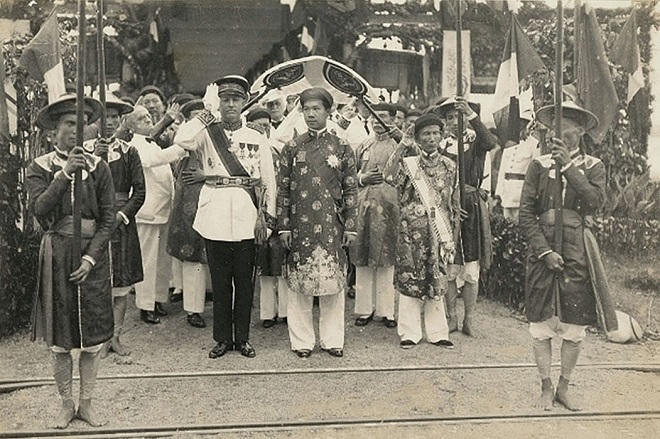 | Vua Bảo Đại tại lễ đón tiếp khi đến thăm Tòa thị chính Đà Nẵng ngày 8/9/1932. Bên tay phải nhà vua là Khâm sứ Châtel, bên tay trái là Thượng thư Bộ lại Nguyễn Hữu Bài |